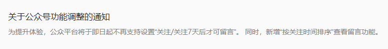 近日微信公眾號后臺發(fā)布一則通知,關(guān)于微信留言更新的內(nèi)容:此后微信公眾號留言不再支持設(shè)置「關(guān)注/關(guān)注7天后才可留言」,同時新增「按關(guān)注時間排序」查看留言功能。