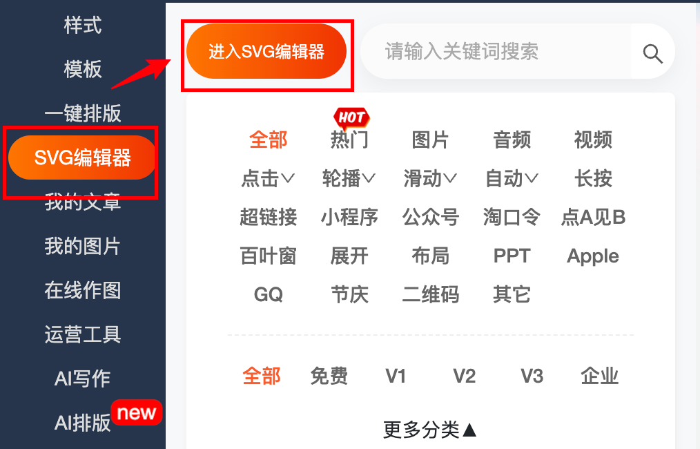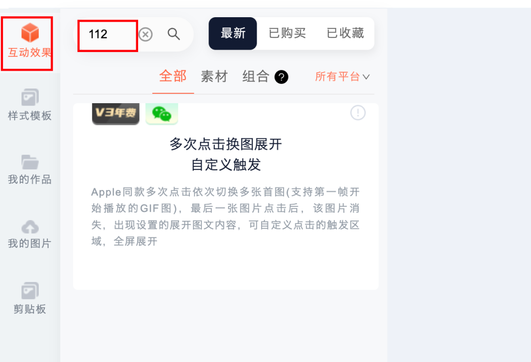 ① 首先在編輯器頁面左側選擇【SVG編輯器】,進入SVG編輯器之后在【互動效果】中搜索組件ID:112,名稱:多次點擊換圖展開,將其放到編輯頁面。