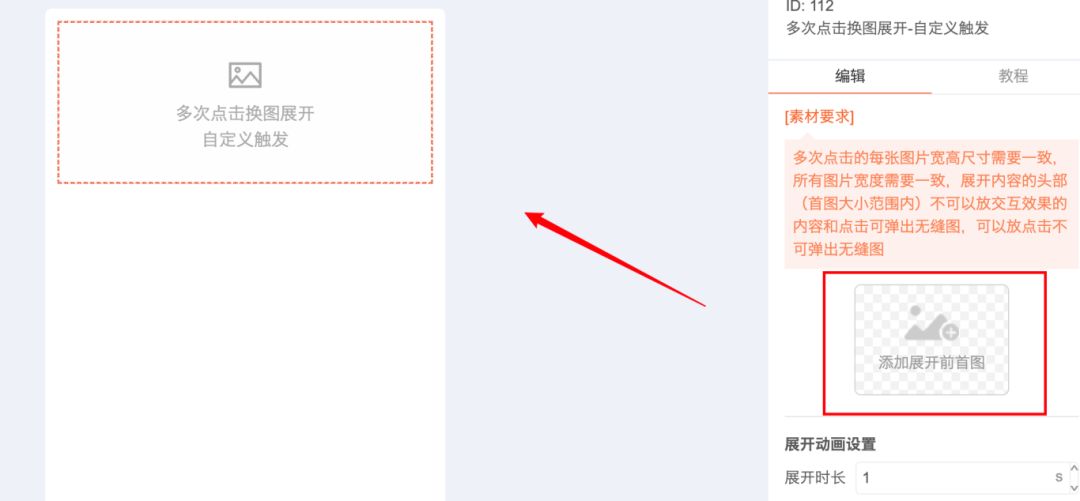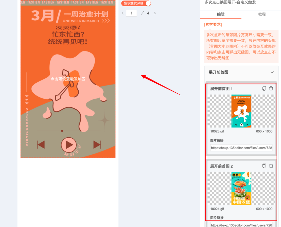 ③添加完展開前的首圖后,就需要為每張圖片設置觸發(fā)點擊切換的區(qū)域,拖拽紅色虛線區(qū)域,即可改變觸發(fā)區(qū)域的大小和位置,修改完第一張圖片的熱區(qū)后,點擊右上角箭頭進行翻頁,依次為后面的圖片進行添加。