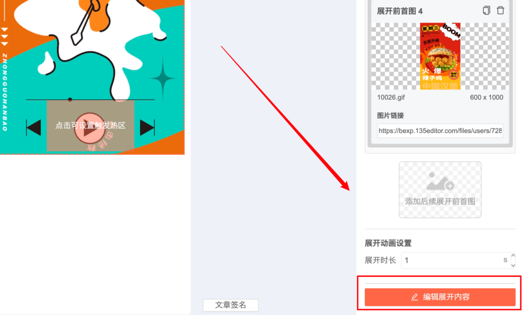 ④接著我們就需要為組件添加展開后的圖片內容,點擊【編輯展開內容】,在這里面根據自己的需求選擇對應的組件即可。塔斯汀的這篇推文在展開后的部分主要添加了無角標小程序以及批量無縫圖組件。