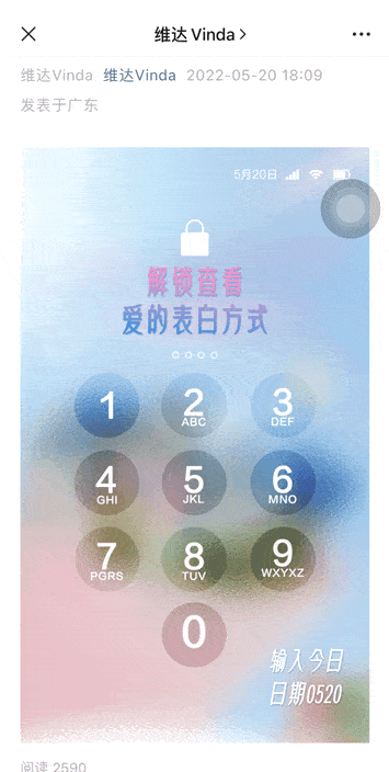 這篇文章是維達520主題推文,他們在開篇部分設計了手機解鎖界面的視覺效果,并以0520作為密碼線索,引導用戶輸入對應文字來解鎖全文。