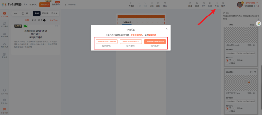 制作好后,我們可以選擇「導(dǎo)出」復(fù)制到135編輯器中,在SVG編輯器右上角找到「導(dǎo)出」選擇「復(fù)制代碼到135編輯器」