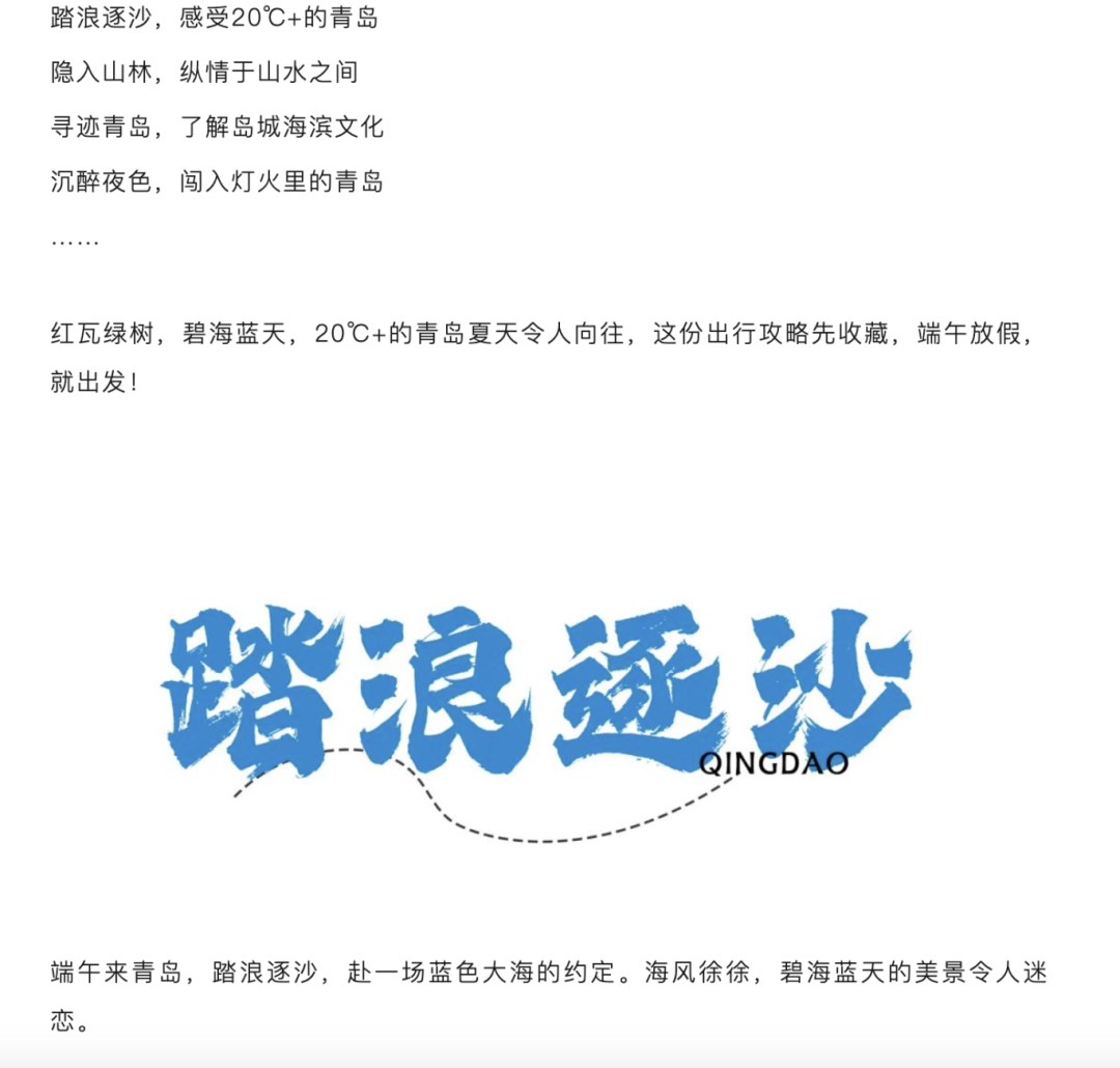 ① 青島市文化和旅游局的推文內(nèi)容排版簡約,字間距、行間距設(shè)置合理,推文段落利用小標(biāo)題樣式劃分適中,讓每段內(nèi)容清晰明了。