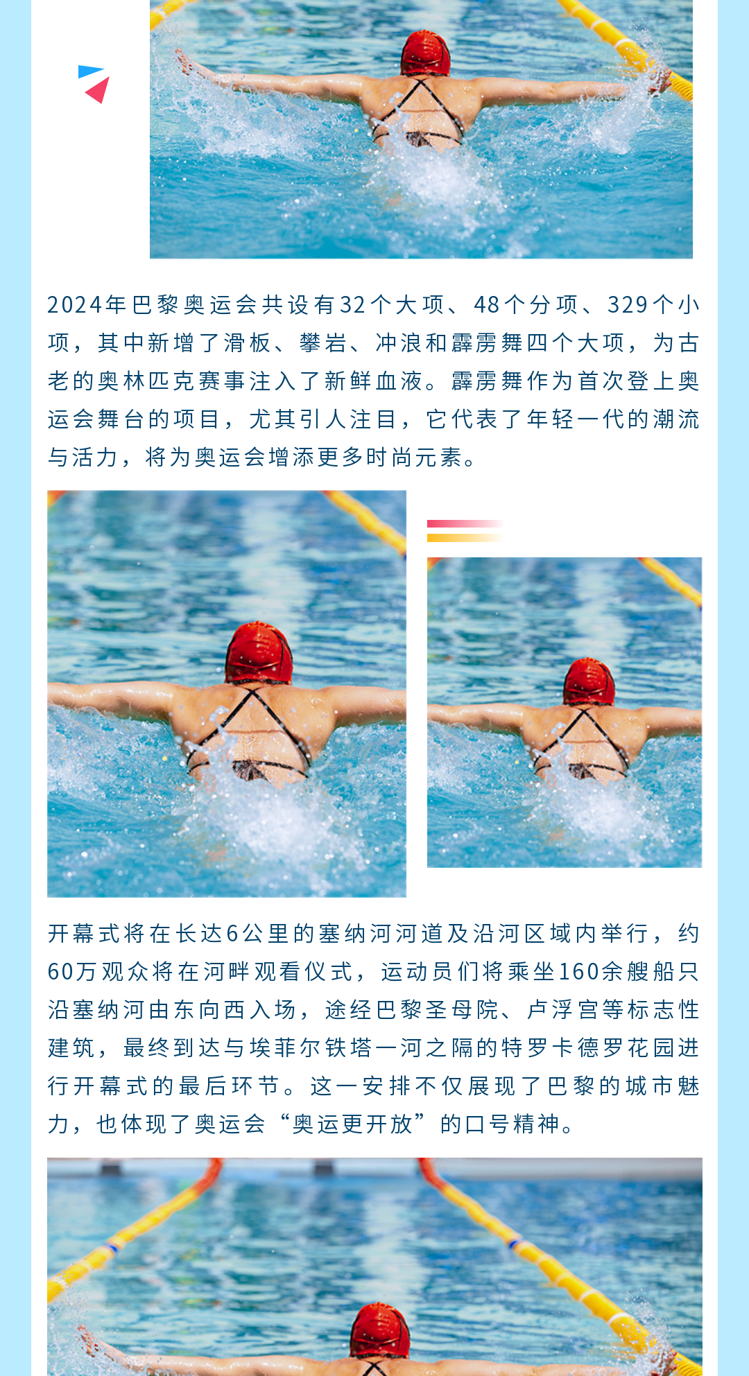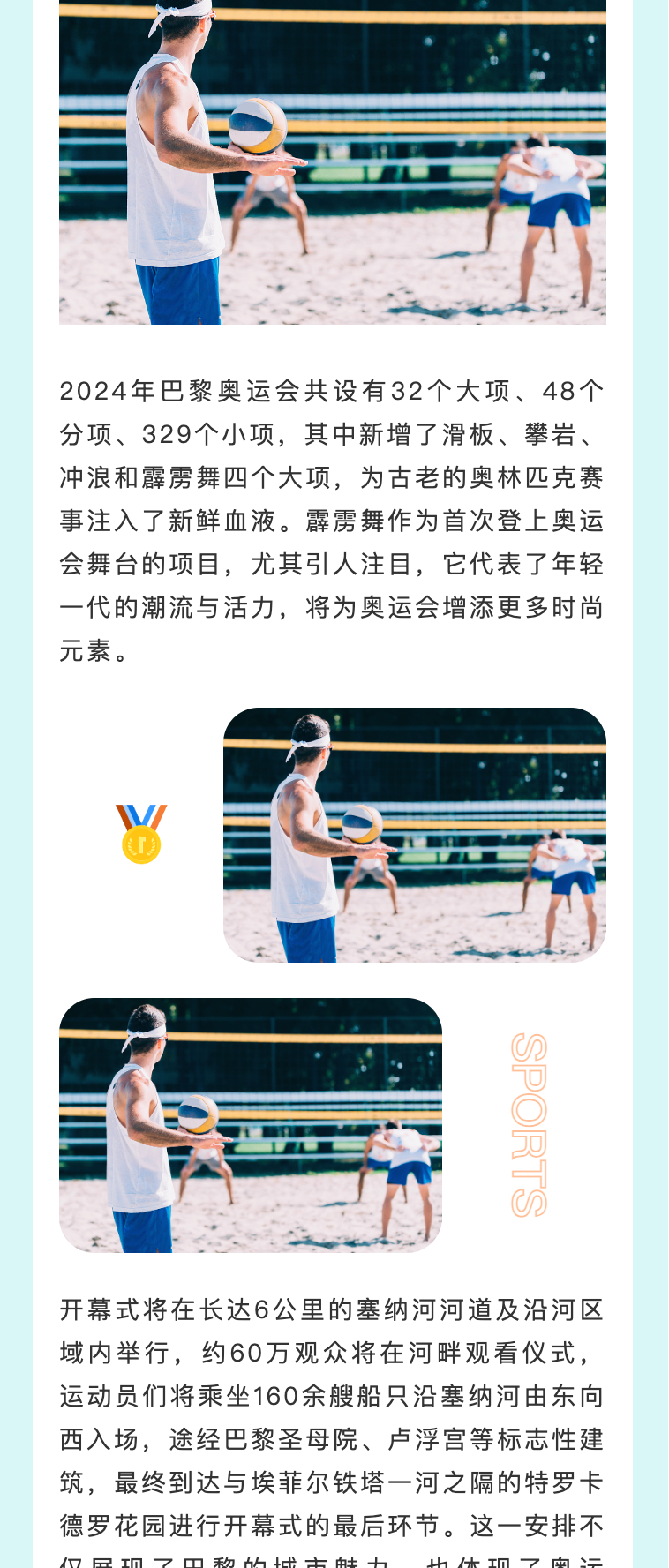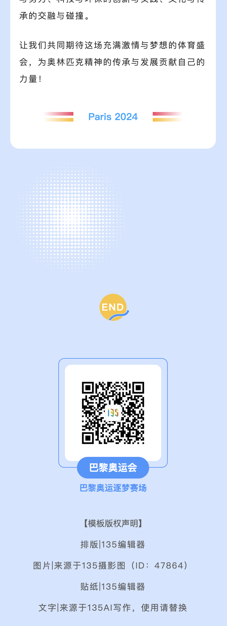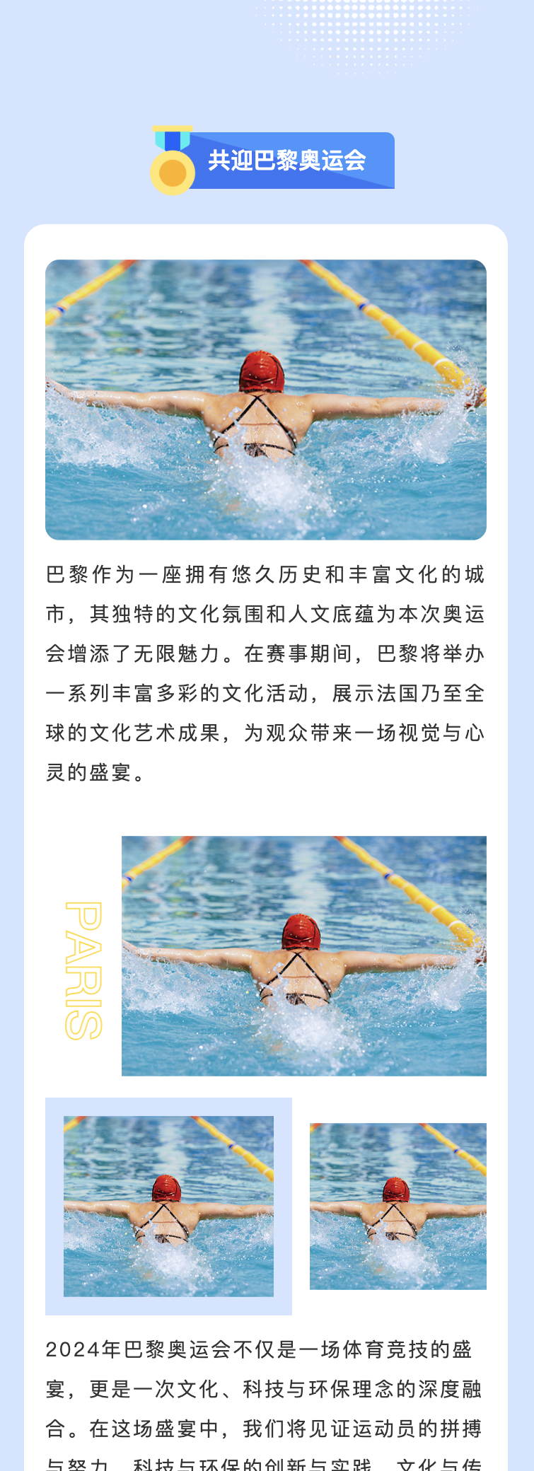 為慶祝2024年巴黎奧運會,我們精心策劃了一系列專為公眾號設(shè)計的奧運會模板。這些模板以其高級感和創(chuàng)意設(shè)計,完美契合奧運主題,讓您的公眾號內(nèi)容在這場體育盛事中獨樹一幟。無論是賽事預(yù)告、精彩瞬間分享,還是奧運精神的傳達,我們的模板都能滿足您的需求?,F(xiàn)在就來體驗這些專為公眾號定制的奧運會模板,讓您的報道更加生動、更具吸引力。