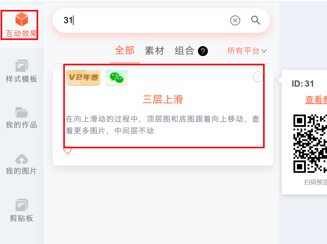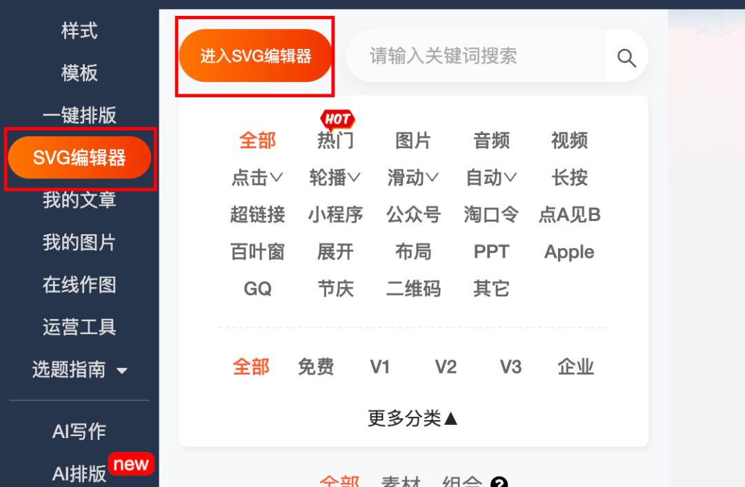 在135編輯器頁面左側(cè)選擇【SVG編輯器】——【進(jìn)入SVG編輯器】,在互動(dòng)效果中搜索ID:31,將該效果放在編輯頁面。