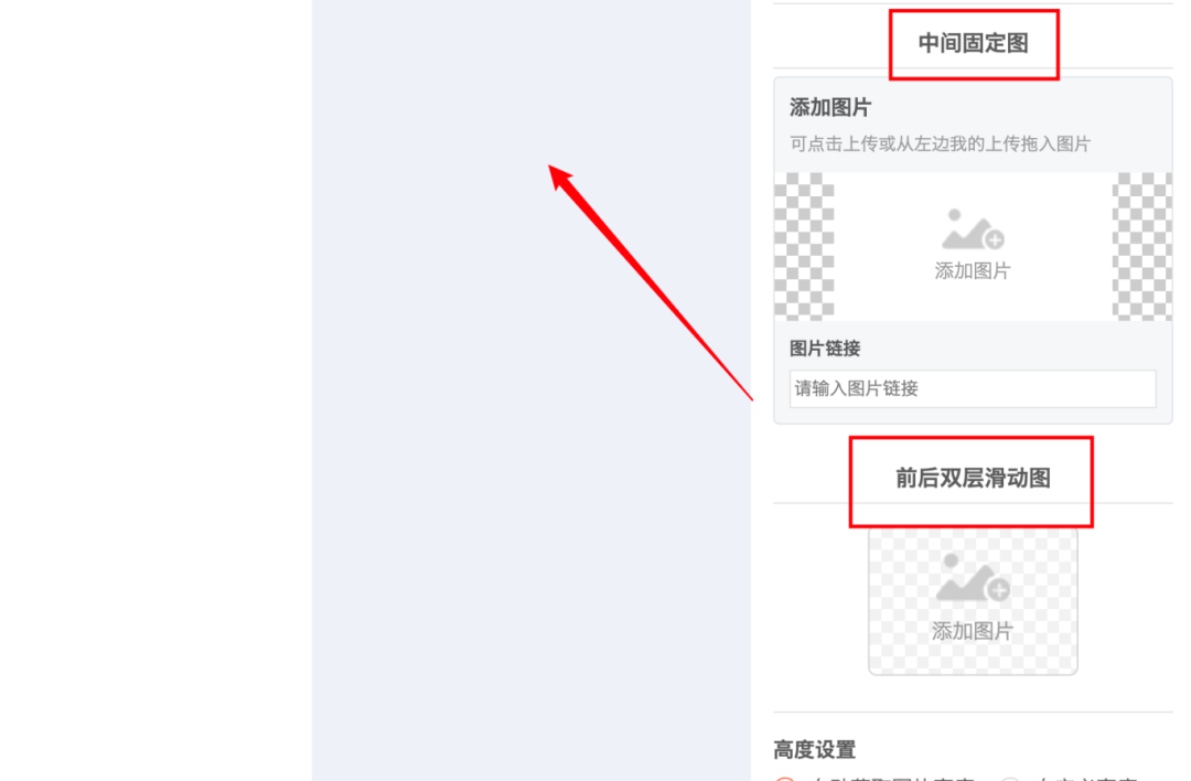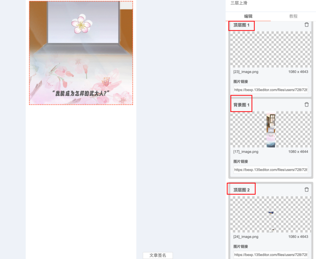 在這里我以武漢大學(xué)的推文作為示例進(jìn)行操作講解。按照組件要求上傳對應(yīng)的圖片,這里需要上傳三層圖片,中間固定層、頂層滑動(dòng)圖、背景圖,在這篇推文中,櫻花元素為中間固定層,圖片為PNG格式。