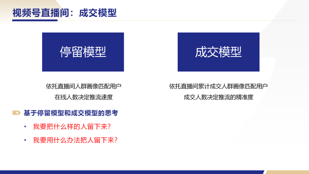 那在整個視頻號直播過程中,最最關鍵的一件事就是去做好人群的承接工作!在這個環(huán)節(jié)中,有兩個非常重要的模型,我們叫做停留模型和成交模型。