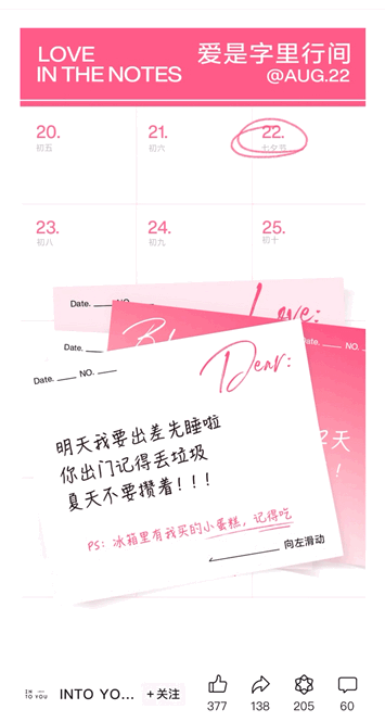 INTO YOU的這篇七夕推文,圍繞愛是什么的主題來展開全文內(nèi)容,開篇利用便簽設(shè)計(jì)和SVG組件的搭配,讓用戶感受到便簽字里行間里體現(xiàn)出的濃濃愛意,激發(fā)用戶繼續(xù)閱讀的興趣。
