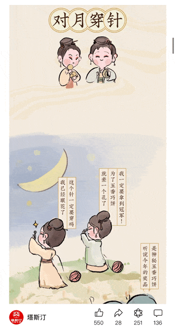 如何讓七夕傳統(tǒng)習(xí)俗與產(chǎn)品宣傳內(nèi)容巧妙地結(jié)合在一起呢?塔斯汀的這篇推文給了我們很好的示范。他們以七夕傳統(tǒng)習(xí)俗穿針乞巧為創(chuàng)意靈感,通過設(shè)定穿針比賽得五香巧餅的故事展開全文內(nèi)容,讓用戶懷著好奇心,跟隨條漫中的兩位主人公一步步地揭曉五香巧餅的實(shí)際樣子,這樣的推文玩法既與用戶形成了良好的互動,又將產(chǎn)品宣傳與推文主題自然融合,有效減弱了推文的廣告力度,讓用戶更易接受。