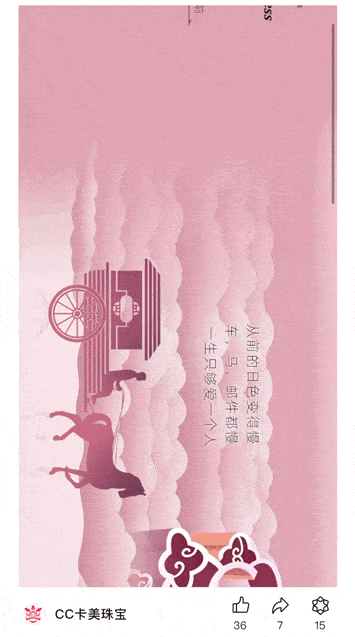 其互動設(shè)計(jì)別出心裁,采用橫屏式排版布局,通過嵌入人駕馬車的互動元素,讓用戶跟隨可滑動的元素了解往昔戀人與亭子之間的故事,借此推出自己的東方愛意·亭系列產(chǎn)品,整體過渡自然不生硬,同時加深了用戶對產(chǎn)品寓意的理解。