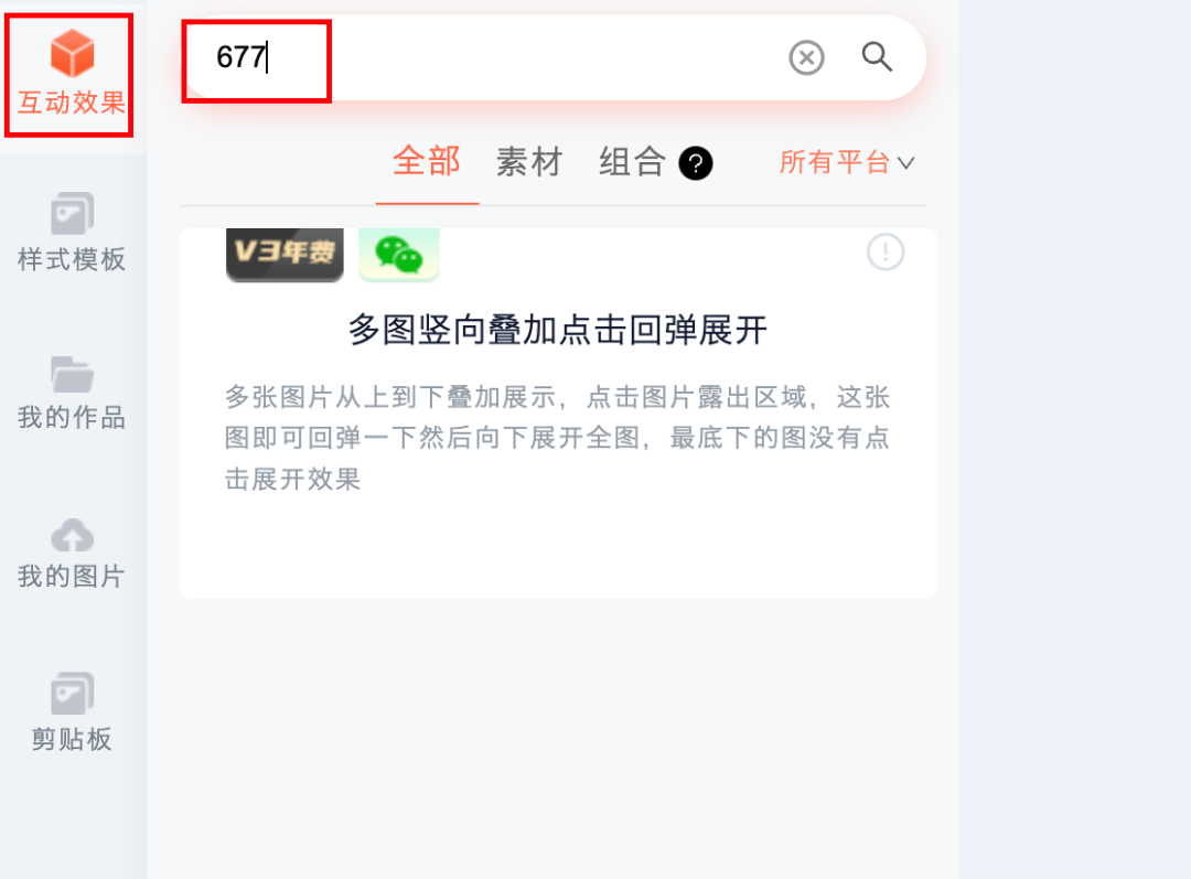 此效果的名稱為多圖豎向疊加點(diǎn)擊回彈展開,SVG效果ID:677。在135編輯器左側(cè)菜單欄選擇【SVG編輯器】,即可進(jìn)入到SVG編輯器界面,在【互動(dòng)效果】中搜索677,即可使用。