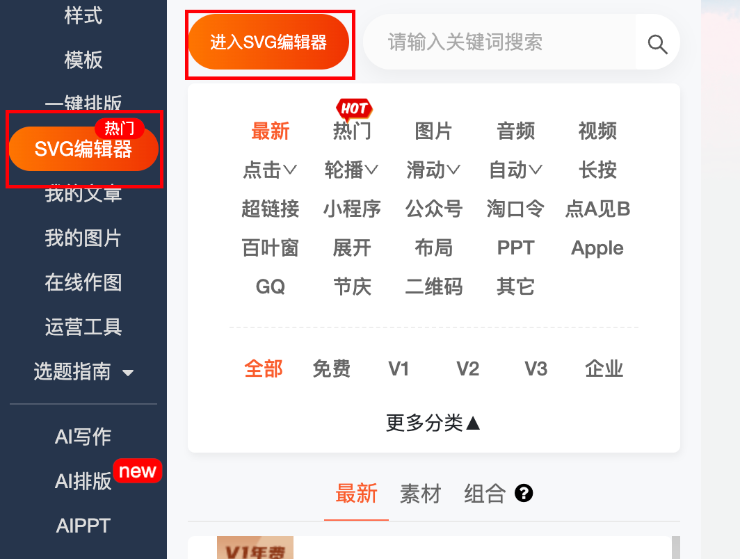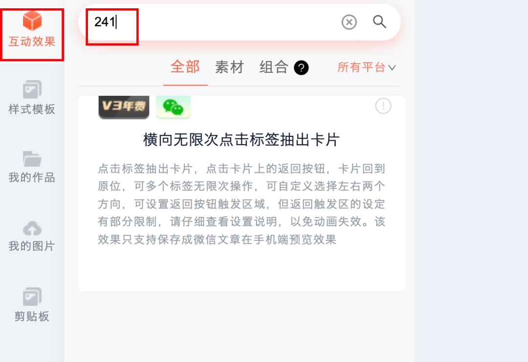 此效果的名稱為橫向無限次點(diǎn)擊標(biāo)簽抽出卡片,SVG效果ID:241。在135編輯器左側(cè)菜單欄選擇【SVG編輯器】,即可進(jìn)入到SVG編輯器界面,在【互動(dòng)效果】中搜索241,即可使用。
