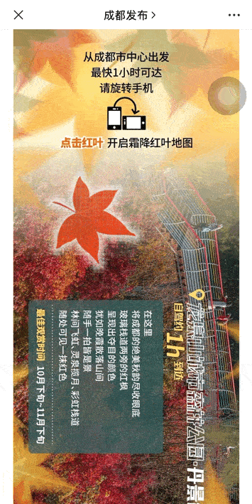 這是成都發(fā)布在霜降節(jié)氣當(dāng)天推出的一篇?jiǎng)?chuàng)意推文,通過利用SVG交互效果和橫屏推文的設(shè)計(jì),給讀者介紹了成都周邊賞紅葉的地點(diǎn)。整篇推文排版設(shè)計(jì)巧妙,讓用戶跟隨飄落的葉片展開閱讀,與用戶之間形成了良好互動(dòng)。