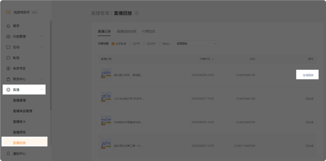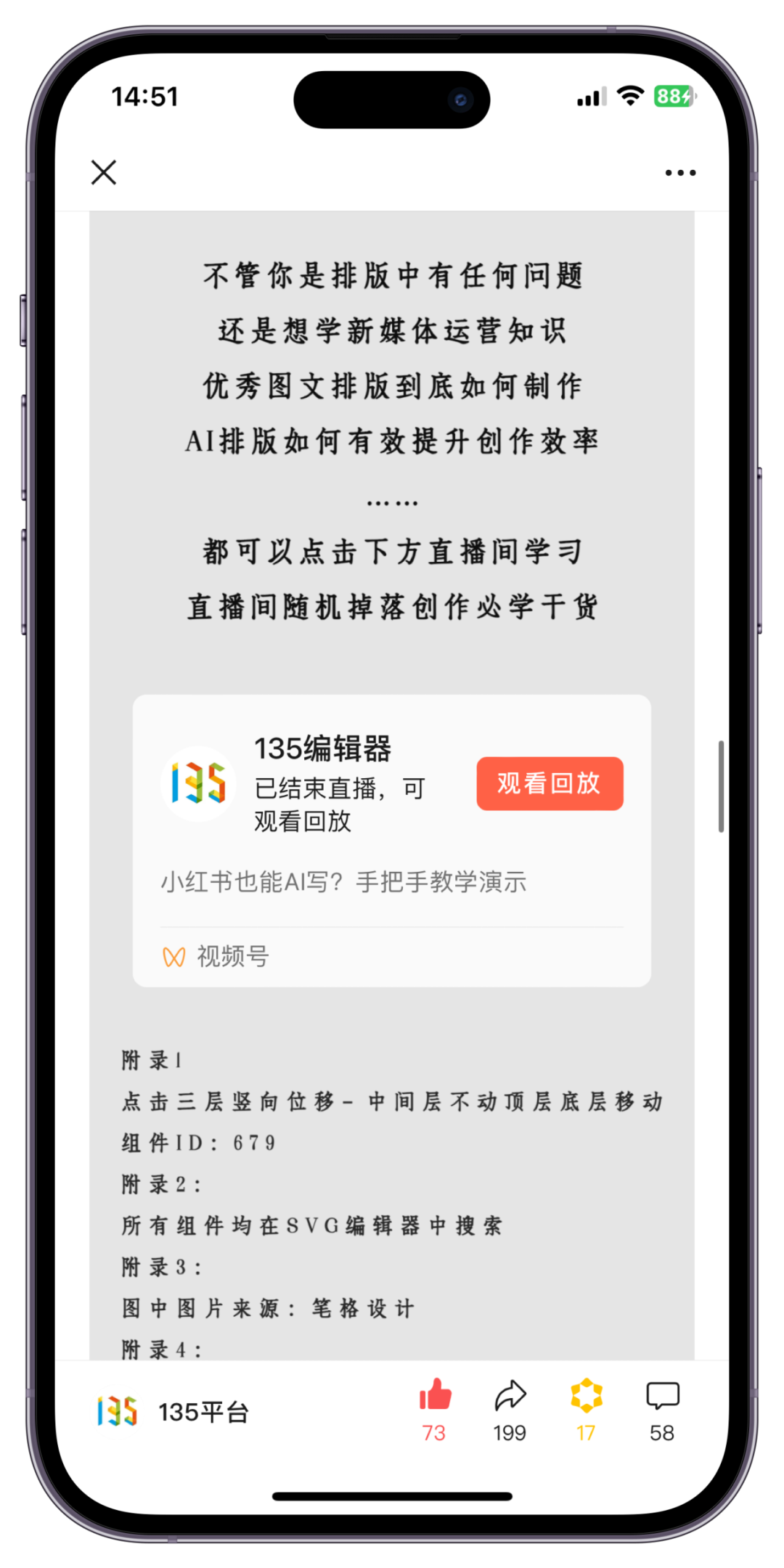 關(guān)于文章中的「觀看回放」,我們需要先在文中插入直播卡片且在視頻號后臺(注意是視頻號后臺而不是微信公眾后臺)對剛剛直播內(nèi)容進行生成回放,直播預(yù)約卡片會自動更改為「觀看回放」