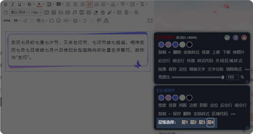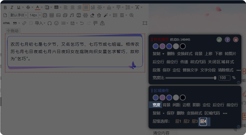 我們在編輯頁面插入樣式或圖片后,在區(qū)域樣式中選擇層級,一定要看清楚我們需要調(diào)整的是哪部分。