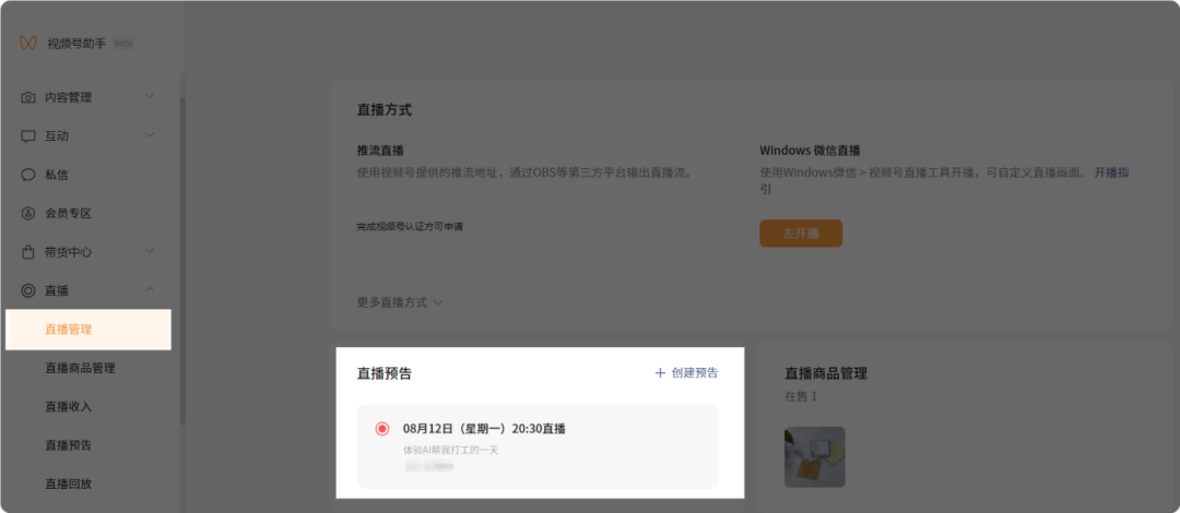 我們先要在視頻號后臺中,創(chuàng)建一個直播預(yù)告。