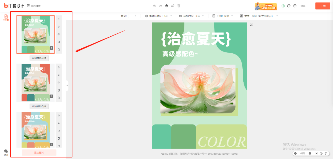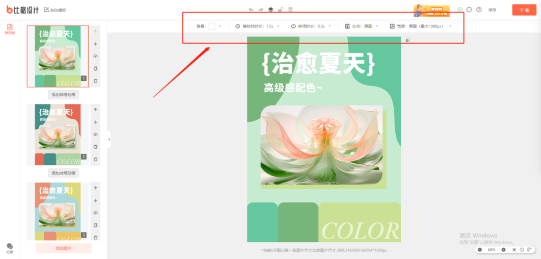 ②尺寸選擇:為了方便大家多場(chǎng)景的應(yīng)用,比格設(shè)計(jì)貼心的設(shè)置了各平臺(tái)GIF圖尺寸的選擇。比如常用的表情包、公眾號(hào)配圖等。大家可以根據(jù)自己的需要選擇尺寸。