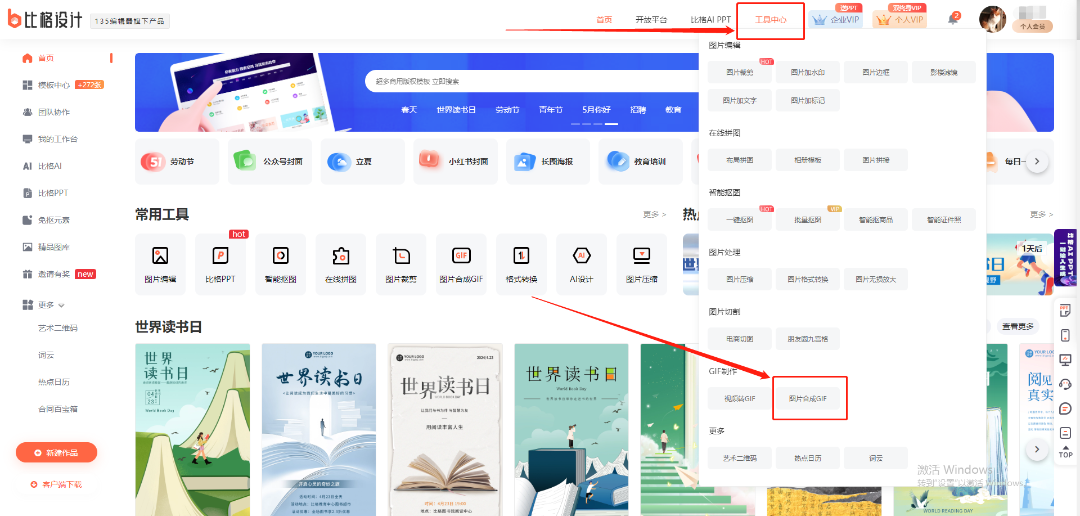 登錄筆格設(shè)計(jì)官網(wǎng)(https://bigesj.com/),將鼠標(biāo)移動(dòng)至首頁(yè)導(dǎo)航欄【工具中心】處,在【GIF制作】功能處點(diǎn)擊【圖片合成GIF】按鈕,即可進(jìn)入操作頁(yè)面。