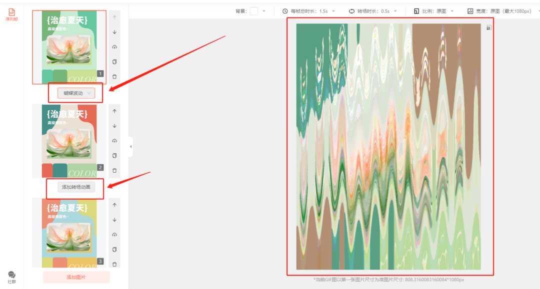 ②添加轉(zhuǎn)場(chǎng)動(dòng)畫:這里有100種動(dòng)畫特效供我們選擇,如翻書、蝴蝶波紋、溶解、交叉變形等。每張圖片的下面都有設(shè)置動(dòng)畫的按鈕,選中其中一種動(dòng)效之后,可以在主頁(yè)面進(jìn)行預(yù)覽。