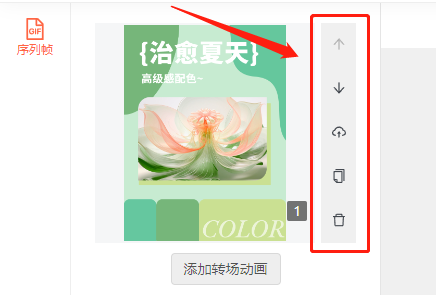 ①在序列幀的每張圖片旁都有五個(gè)按鈕,分別可以實(shí)現(xiàn)調(diào)換圖片位置、重新上傳該圖片、復(fù)制該圖片、刪除該圖片的功能。
