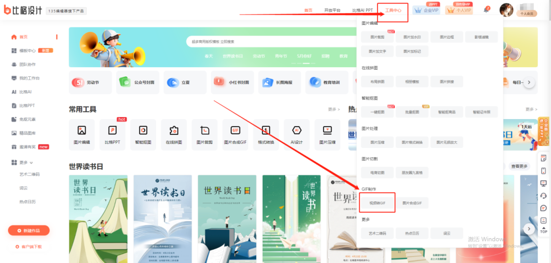 登錄筆格設(shè)計(jì)官網(wǎng)(https://bigesj.com/),將鼠標(biāo)移動(dòng)至首頁(yè)導(dǎo)航欄【工具中心】處,可以看到【GIF制作】功能。點(diǎn)擊【視頻轉(zhuǎn)GIF】按鈕,進(jìn)入操作頁(yè)面。