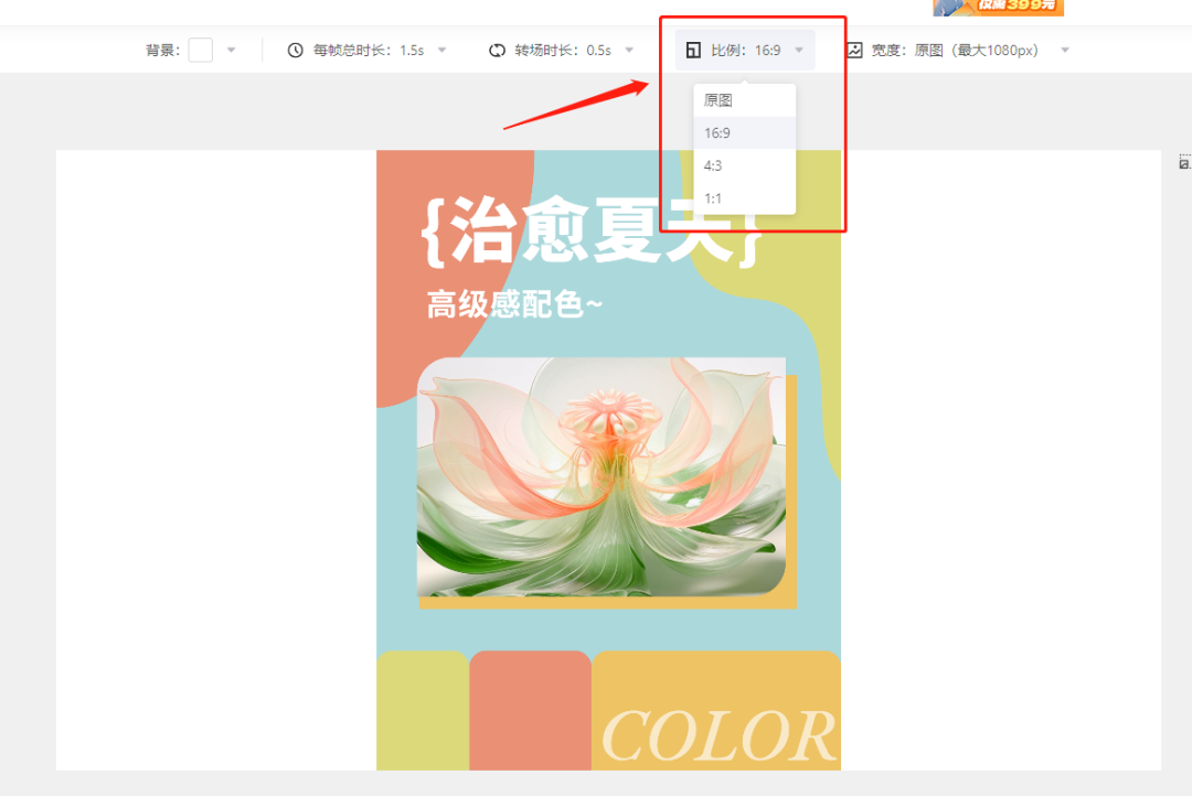 第三步:操作頁(yè)面上方菜單欄中同樣有許多功能,能夠幫助我們?cè)O(shè)置圖片的時(shí)長(zhǎng)、比例等。