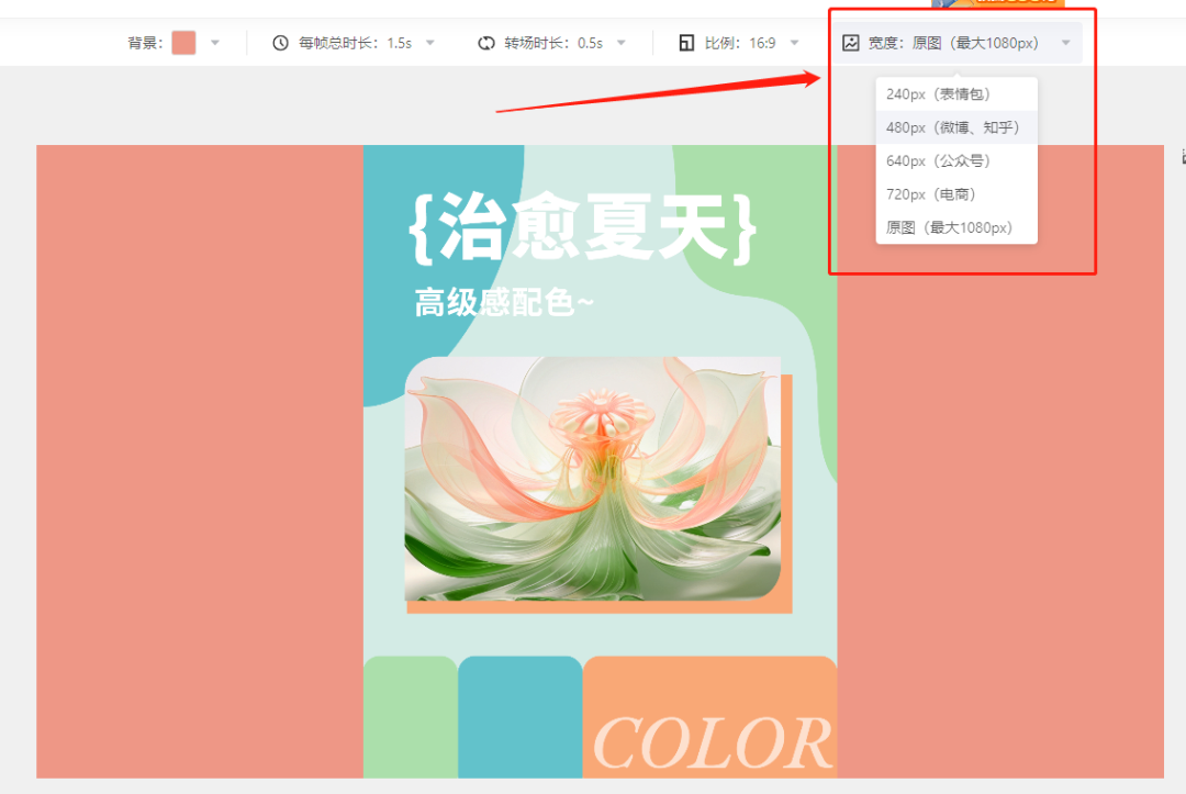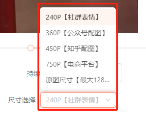 ③寬度設(shè)置:我們還可以根據(jù)需求選擇GIF圖的寬度尺寸。這里有表情包、公眾號(hào)、電商等6種適用場(chǎng)景的寬度尺寸供選擇。