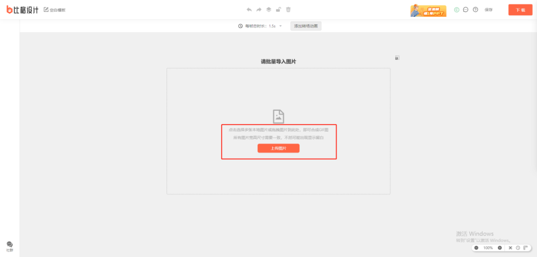 第一步:將需要合成的圖片素材,全部導(dǎo)入比格設(shè)計(jì)中,點(diǎn)擊【上傳圖片】或拖動(dòng)圖片到操作頁(yè)面即可。