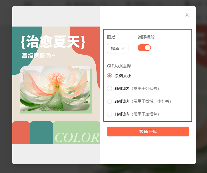 第四步:點(diǎn)擊右上角【下載】按鈕,可以對(duì)GIF圖的清晰度、尺寸大小,以及是否循環(huán)播放進(jìn)行設(shè)置。