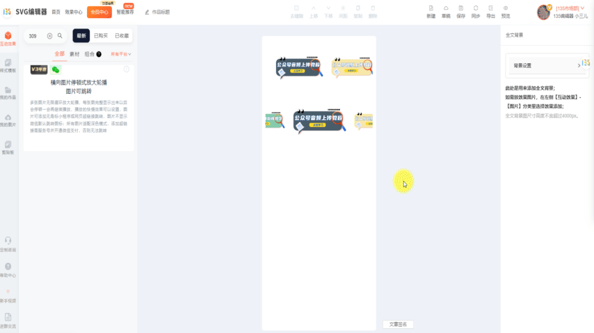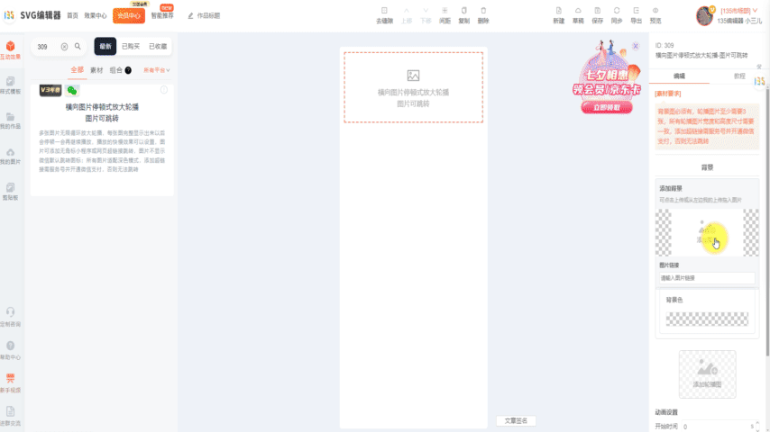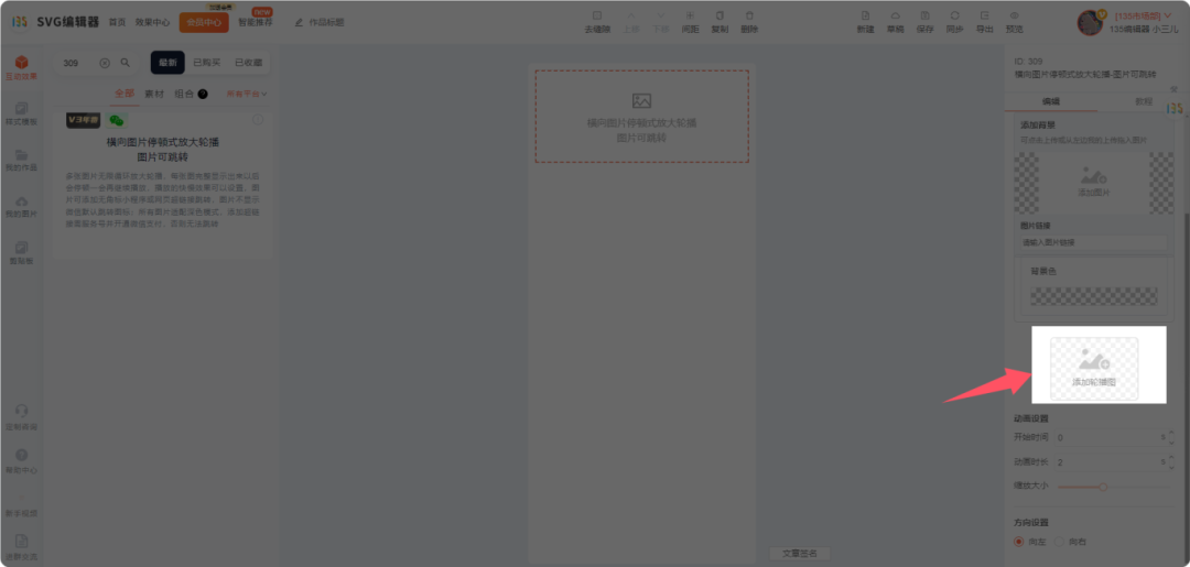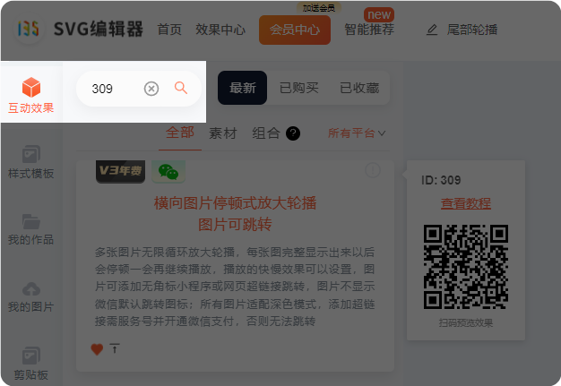 進(jìn)入SVG編輯器后,在「互動(dòng)效果」中輸入組件ID:309,找到組件橫向圖片輪播停頓式放大輪播(圖片可跳轉(zhuǎn))
