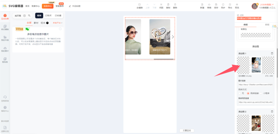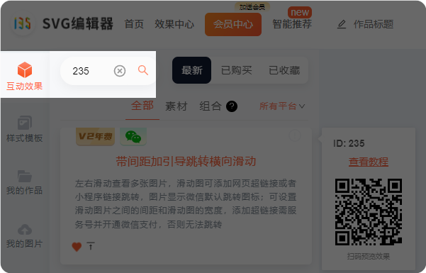 進(jìn)入SVG編輯器后,在「互動(dòng)效果」中輸入組件ID:235,找到組件帶間距加引導(dǎo)跳轉(zhuǎn)橫向滑動(dòng)。