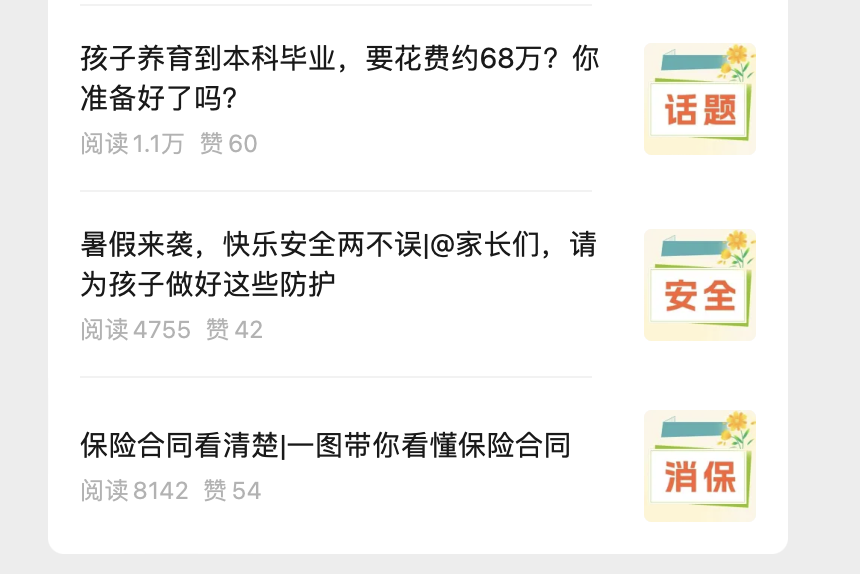 一般情況下,金融保險類選擇的公眾號是服務號,發(fā)布時會帶多條內容,為了讓用戶能一目了然地找到對應主題的文章,同時統(tǒng)一公眾號的視覺審美,我們可以在次條封面圖中放上對應欄目的主題名稱。