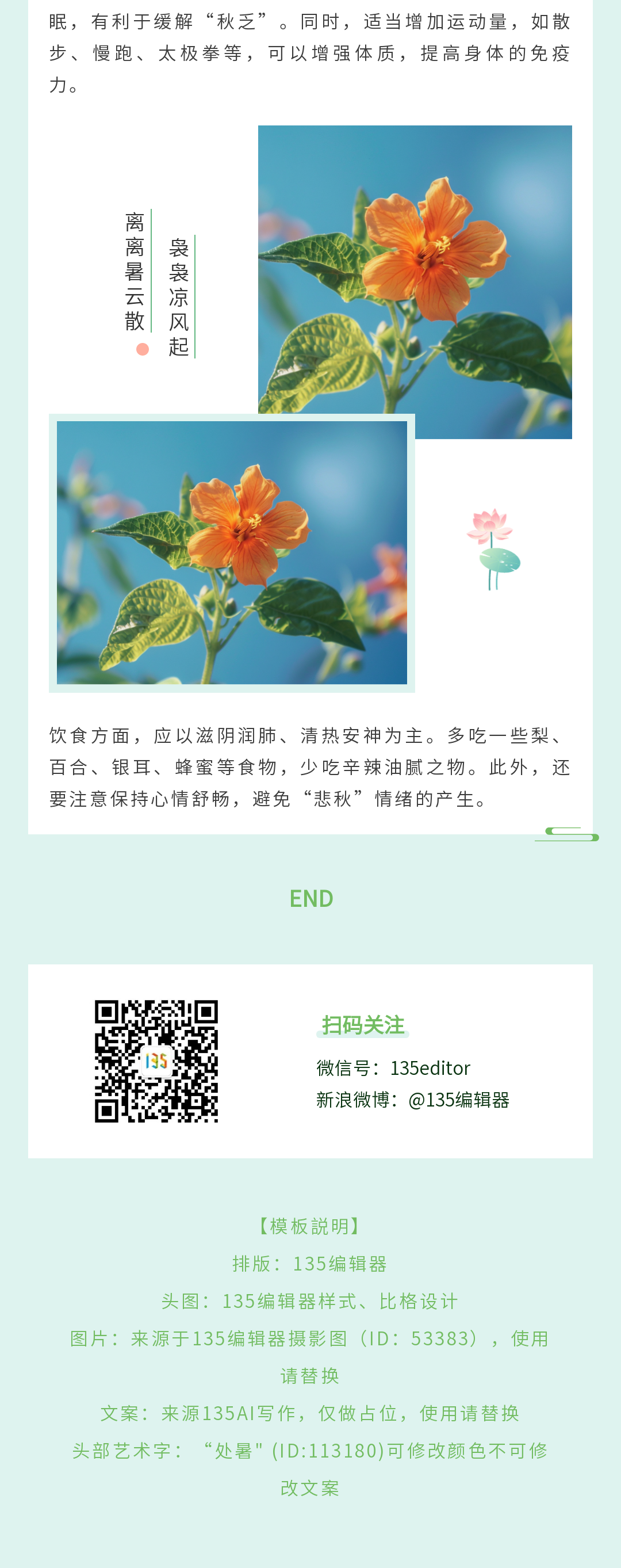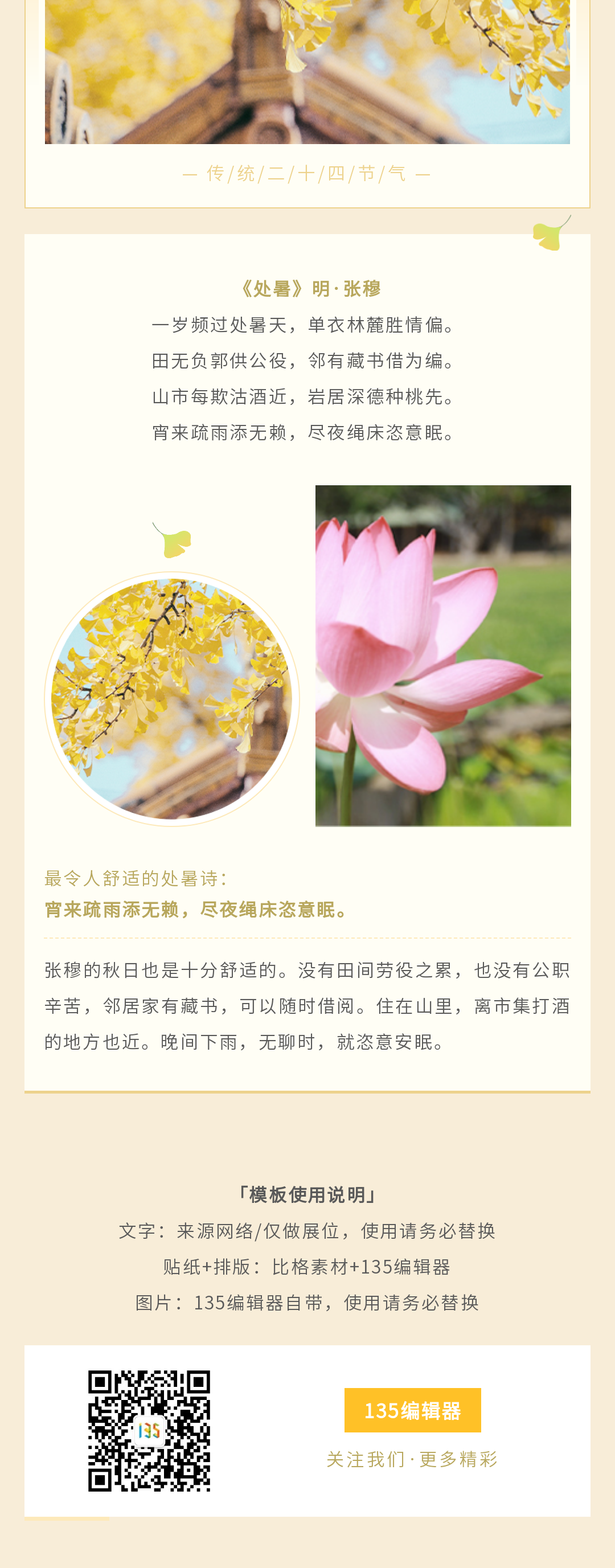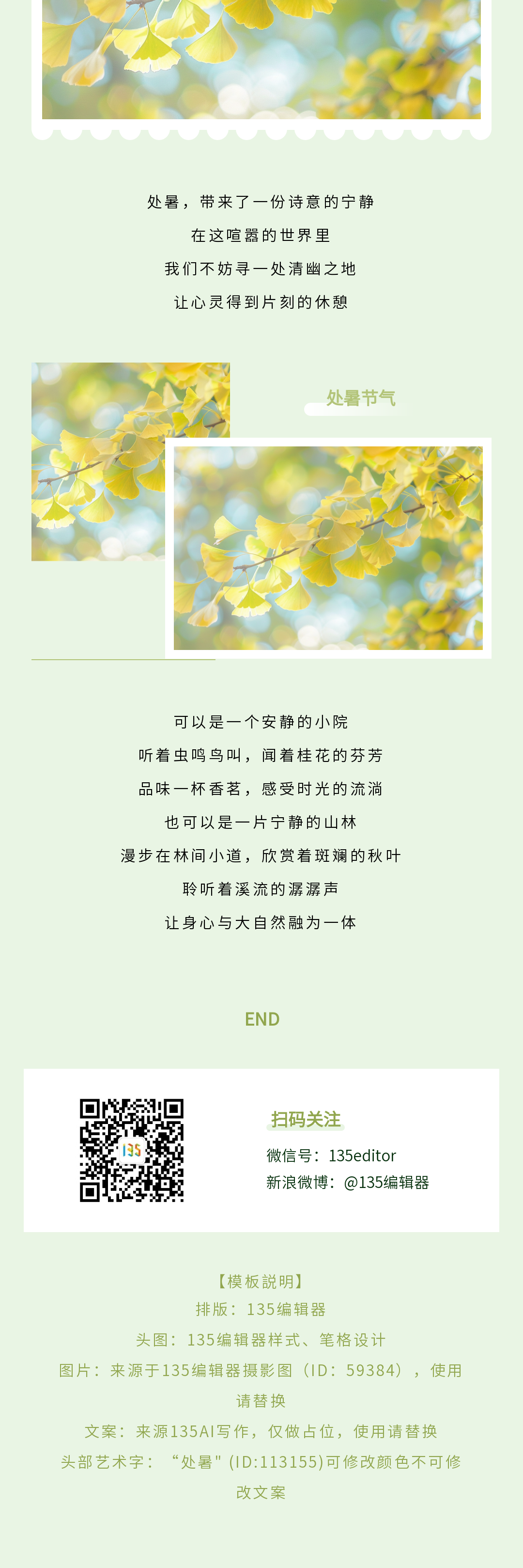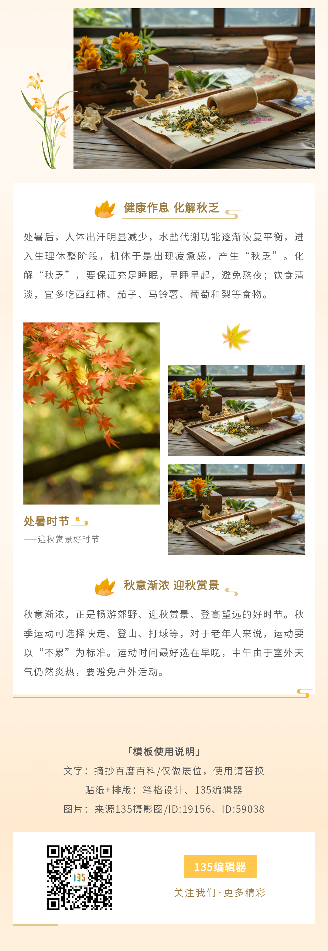 迎接處暑,為你的公眾號注入秋日氣息!《處暑節(jié)氣公眾號模板集錦》精選多款專為秋季設(shè)計的公眾號模板,讓你的內(nèi)容布局更加豐富多彩。無論是秋風漸起的動態(tài)效果,還是秋意盎然的圖文排版,這里都有適合你的創(chuàng)意模板。輕松編輯,快速應用,讓你的公眾號在處暑節(jié)氣煥發(fā)新意,吸引更多關(guān)注。立即體驗,讓你的公眾號與秋風共舞,傳遞秋日的溫馨與美好!