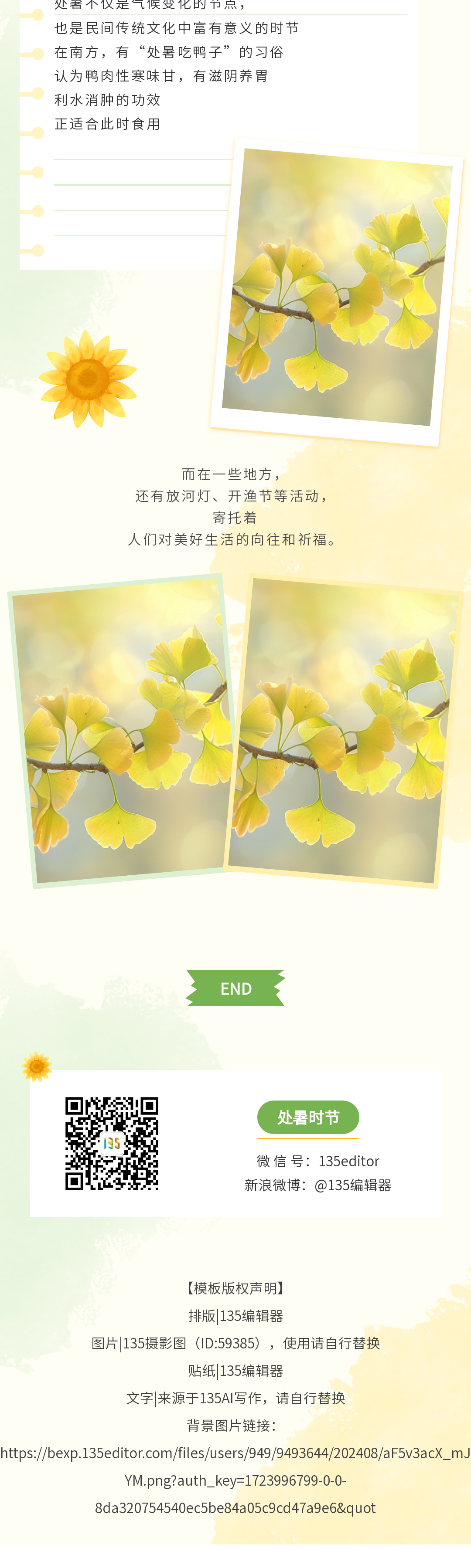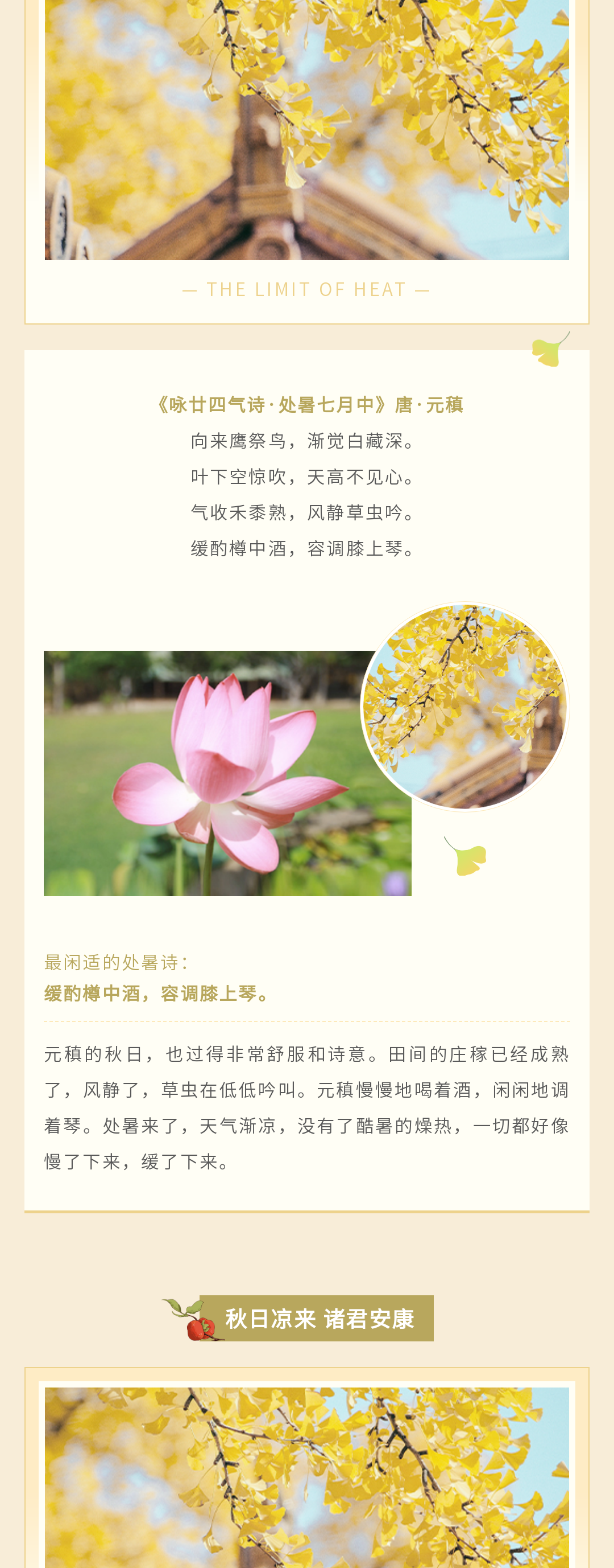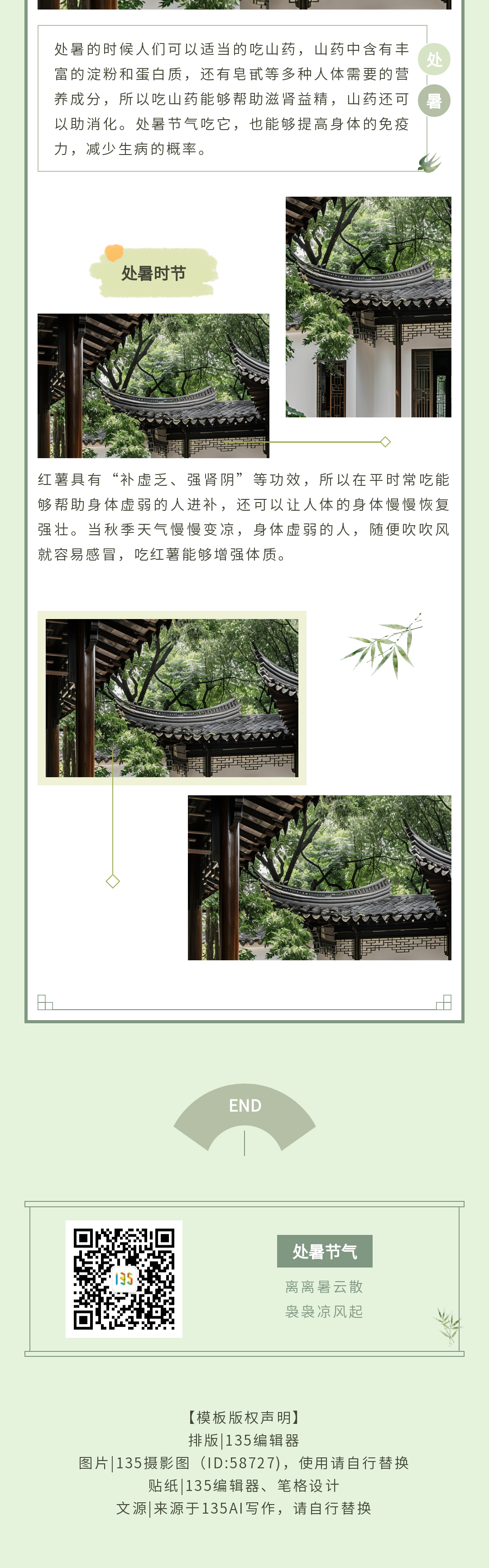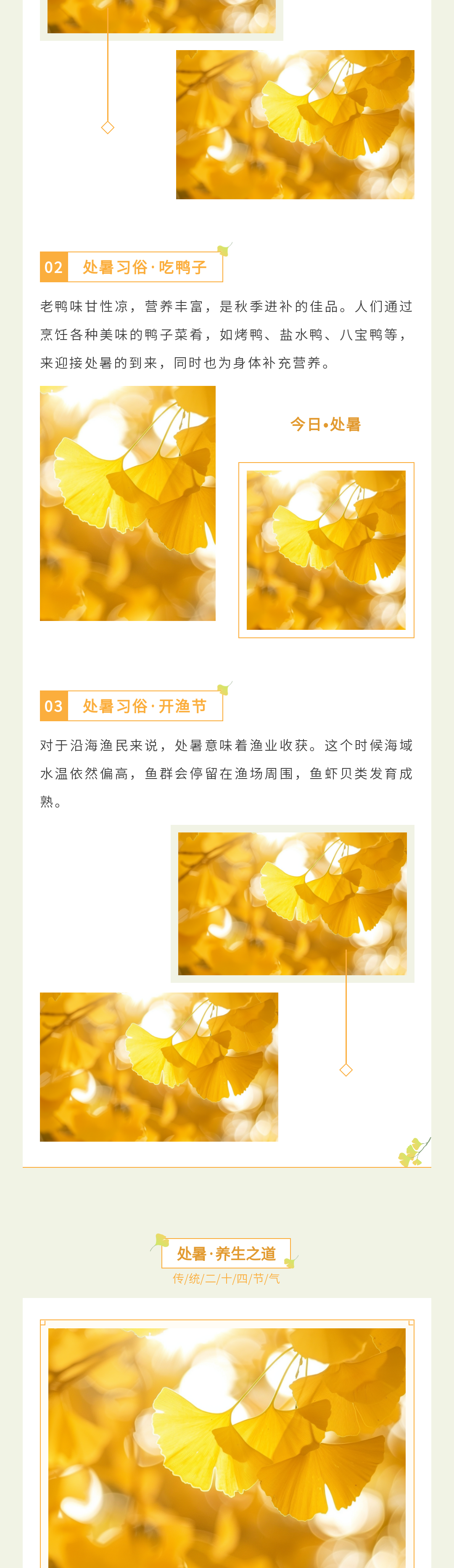 迎接處暑,為你的公眾號注入秋日氣息!《處暑節(jié)氣公眾號模板集錦》精選多款專為秋季設(shè)計的公眾號模板,讓你的內(nèi)容布局更加豐富多彩。無論是秋風漸起的動態(tài)效果,還是秋意盎然的圖文排版,這里都有適合你的創(chuàng)意模板。輕松編輯,快速應用,讓你的公眾號在處暑節(jié)氣煥發(fā)新意,吸引更多關(guān)注。立即體驗,讓你的公眾號與秋風共舞,傳遞秋日的溫馨與美好!