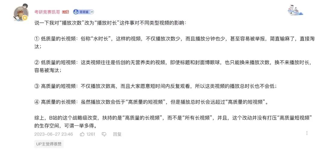 在討論里,大部分 UP主認為這個改動不太影響觀眾的選擇。刷首頁的普通觀眾習(xí)慣了數(shù)字越大的視頻更值得觀看。小鐘一方面非常認可 B站的播放分鐘數(shù)外顯的變化,另一方面他也有顧慮,是否會導(dǎo)致以后 B站的視頻時間需要拉長來應(yīng)對這個變化。
