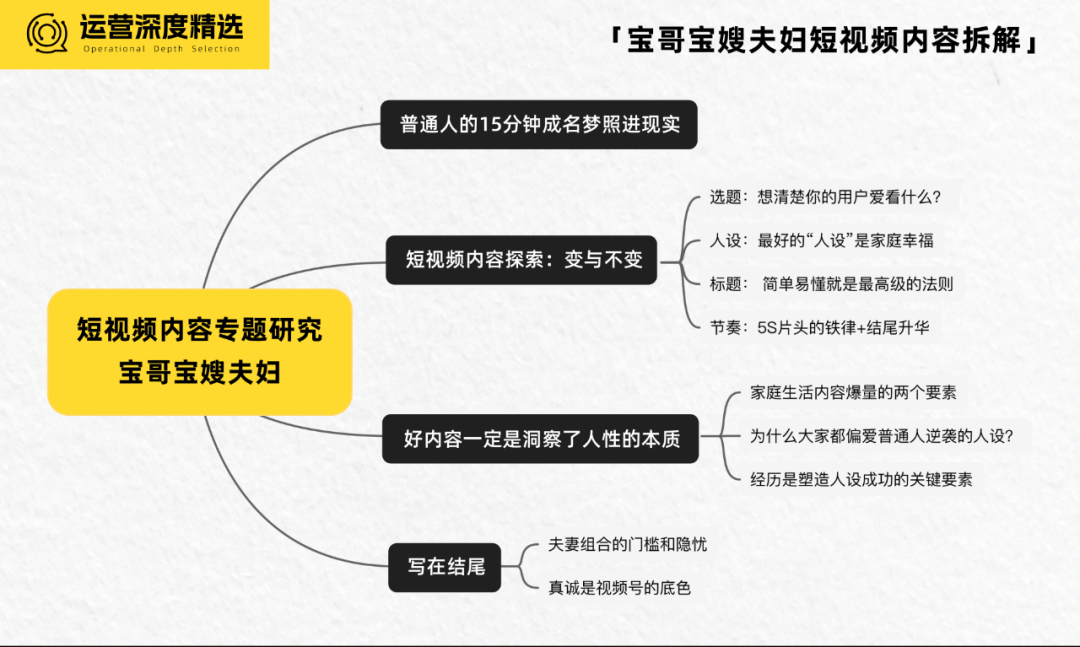 在了解了寶哥寶嫂夫婦視頻號探索的階段之后,為了進一步分析寶哥寶嫂夫婦在短視頻中做對了什么,挖掘底層不變的邏輯,我們也從選題、人設、標題、節(jié)奏四個方面進行了更深入細致的拆解: