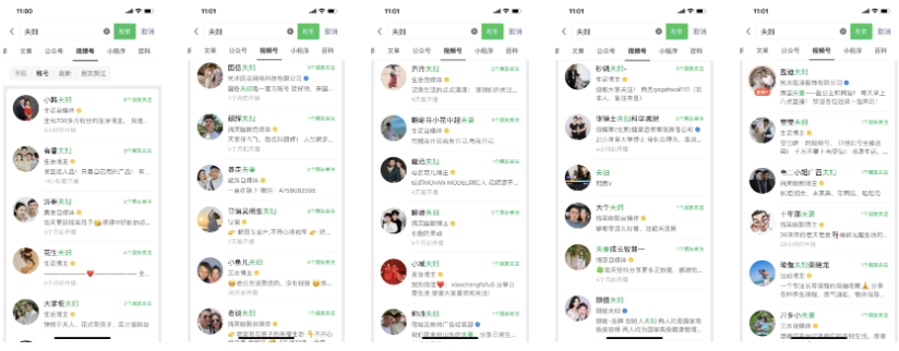 毋庸置疑的是:機會越大,競爭也越大。在抖音,你會先發(fā)現(xiàn),只要搜索夫婦組合,出現(xiàn)的素人以及明星夫婦數(shù)不勝數(shù),視頻號雖然競爭遠沒有那么激烈,但以“夫婦”、“夫妻“命名的賬號也非常多,粗略估計不下200個,這還不包括那些沒有直接在賬號名稱中體現(xiàn)的夫妻組合。