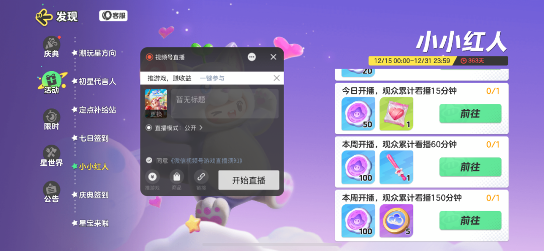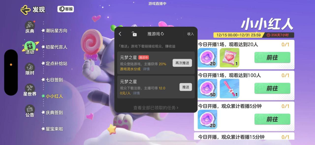 以騰訊最新上線的派對游戲《元夢之星》為例,在游戲中專門設(shè)置了視頻號開播任務(wù),玩家可以實現(xiàn)一鍵開播,系統(tǒng)可以自動匹配封面等基礎(chǔ)設(shè)置。另外在「推游戲」列表中,系統(tǒng)還自動匹配到了元夢之星的推廣任務(wù)——