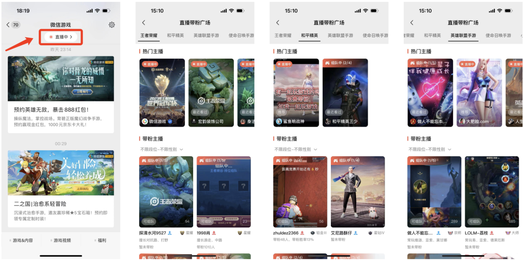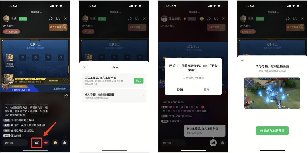 說到組隊排位,在開啟「一起玩」功能的直播間,主播在組隊階段時,用戶可通過下方游戲手柄按鈕搶位加入主播的隊伍,當然也需要完成主播設(shè)置的關(guān)注、評論等條件。搶位成功后,微信將自動調(diào)用戶的《王者榮耀》App,同時用戶也可以選擇是否開啟視頻號直播。