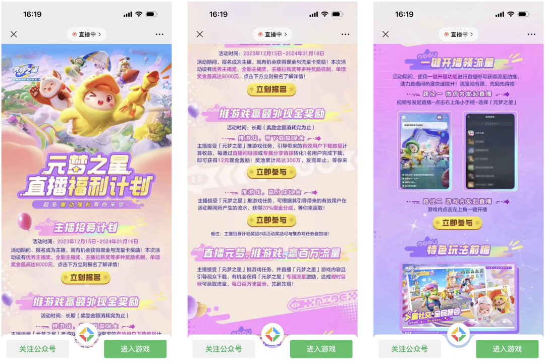 除了推廣任務(wù)的獎勵之外,在元夢之星的直播福利計劃中,還為主播準備了專屬流量激勵以及「一鍵開播」流量助推。
