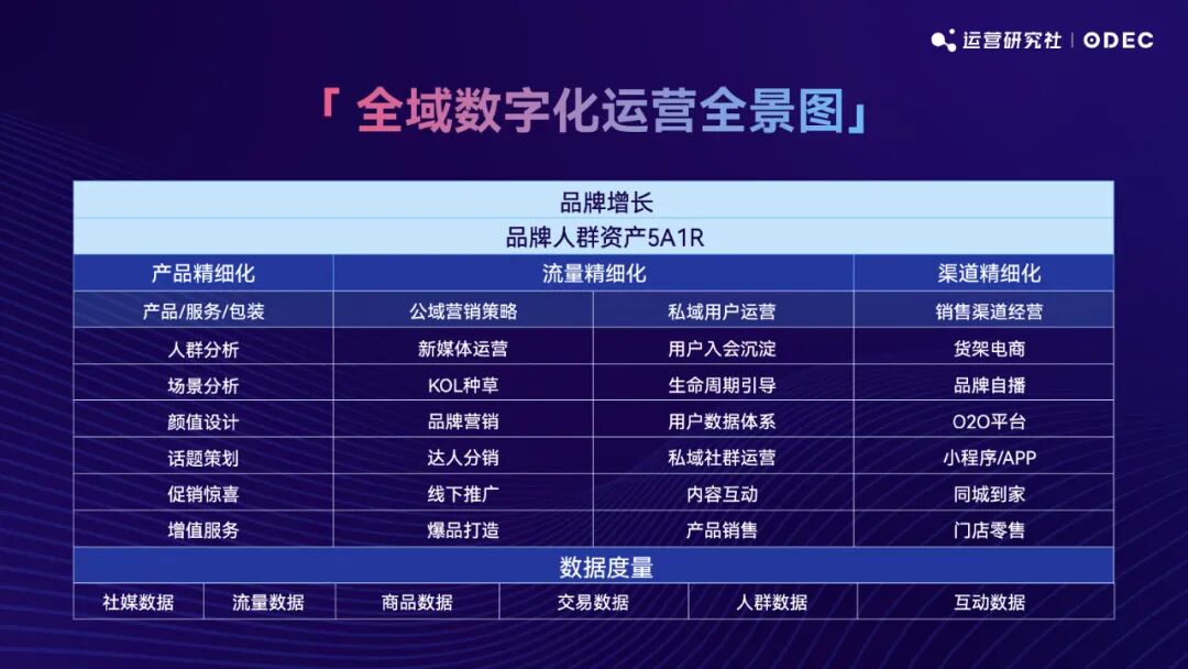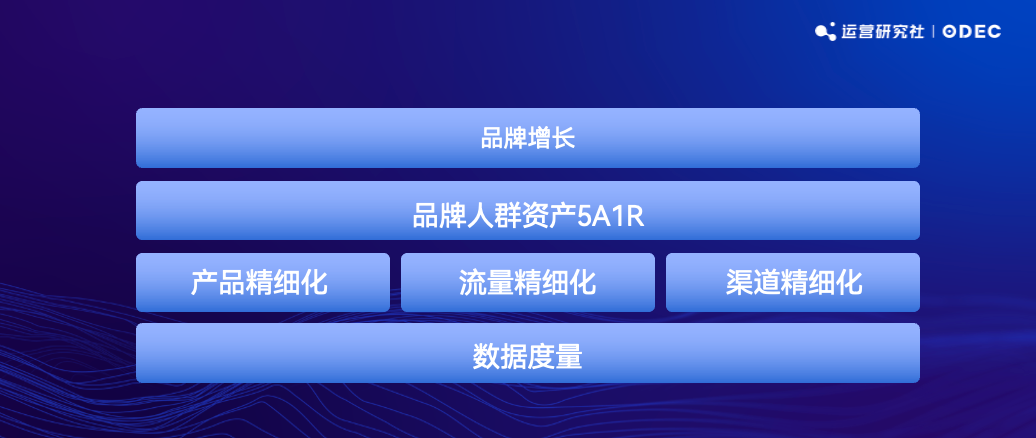 當(dāng)下品牌進(jìn)入「量化式增長」時(shí)代,品牌可借助數(shù)字化帶來的量化能力做精細(xì)化運(yùn)營,實(shí)現(xiàn)增長。在分享中,小賢老師總結(jié)了品牌增長的三個(gè)精細(xì)化運(yùn)營方向,分別為「產(chǎn)品精細(xì)化」、「流量精細(xì)化」、「渠道精細(xì)化」。并基于品牌人群資產(chǎn)的 5A1R 分層模型,重磅提出了「全域數(shù)字化運(yùn)營全景圖」。