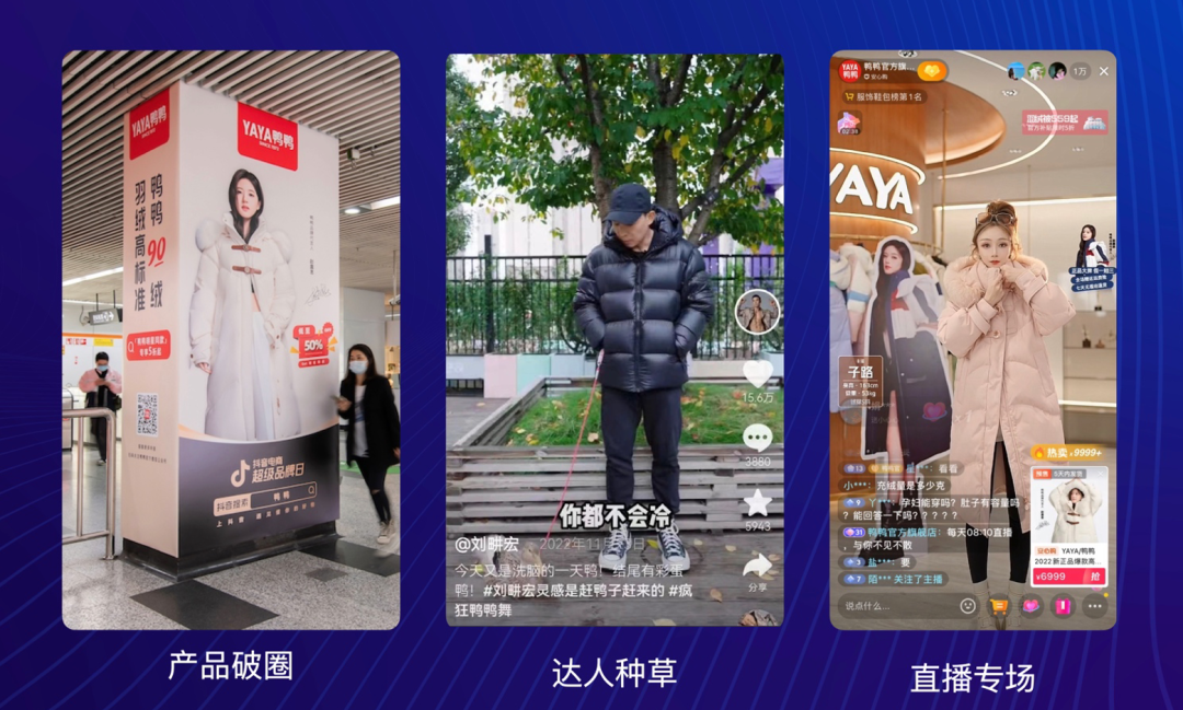 人群積累完成后,在 12 月份羽絨服售賣的黃金時(shí)間點(diǎn),鴨鴨會通過巨量千川的精準(zhǔn)觸達(dá) A1、A2、A3 人群,告知直播間“今天有折扣”, 最終引爆銷量。