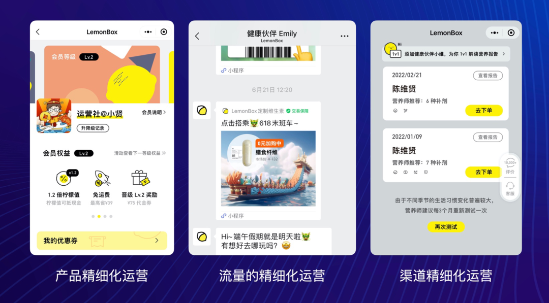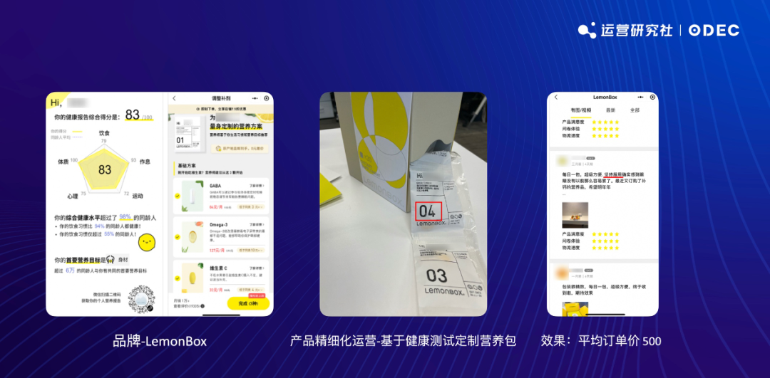 比如 LemonBox 通過「營養(yǎng)包」品類做了定制化升級和創(chuàng)新,通過「FFQ 營養(yǎng)測評」向用戶推薦個(gè)性化營養(yǎng)方案,確保用戶只補(bǔ)充所需,不多吃也不少吃。通過給到用戶更好的產(chǎn)品使用體驗(yàn),將營養(yǎng)包的單價(jià)做到了 500 元,季度復(fù)購率在 30% 。
