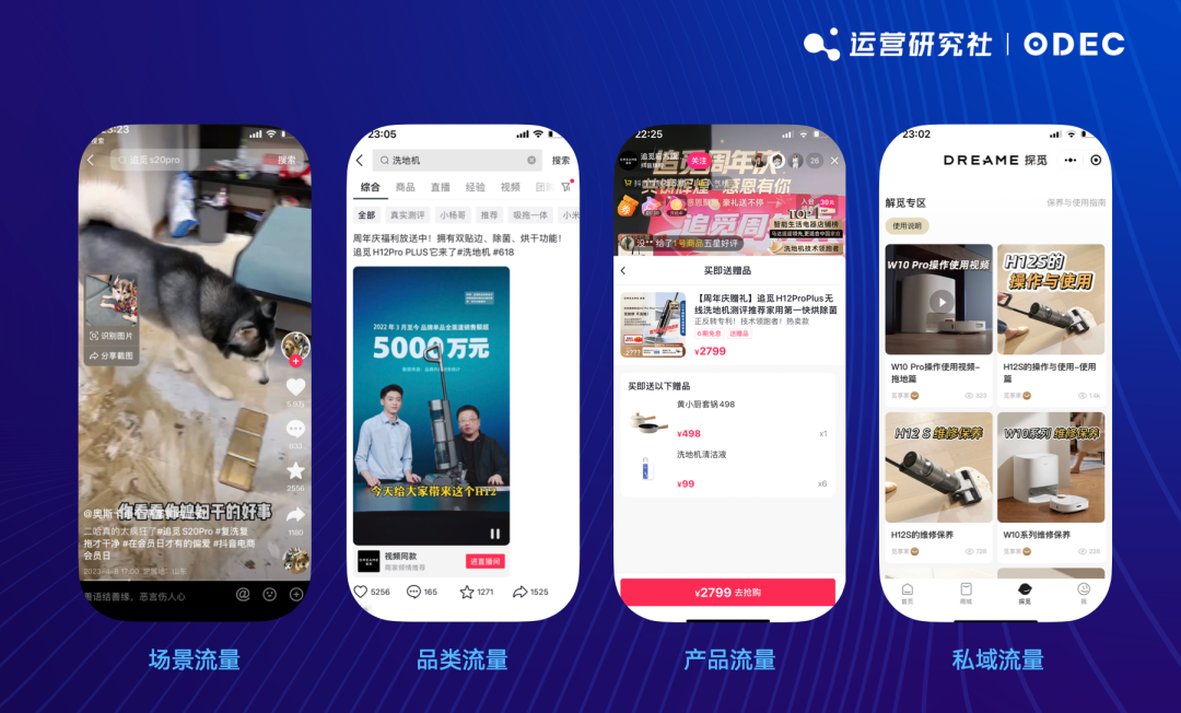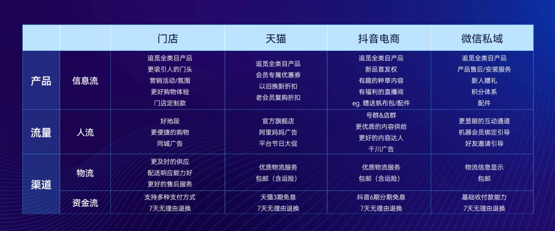在這里我以追覓為例,梳理出了品牌在不同銷售渠道的「經(jīng)營四流」情況。比如追覓在不同銷售渠道提供的產(chǎn)品信息流存在很大的差異: