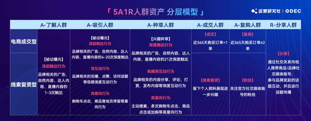 舉個(gè)例子,如果你看完了品牌的短視頻或者進(jìn)行點(diǎn)贊,按照 5A1R 入群資產(chǎn)分層標(biāo)準(zhǔn),你屬于「成交人群」。品牌對于「成交人群」人群的精細(xì)化運(yùn)營方向是引導(dǎo)成為復(fù)購人群、分享人群。