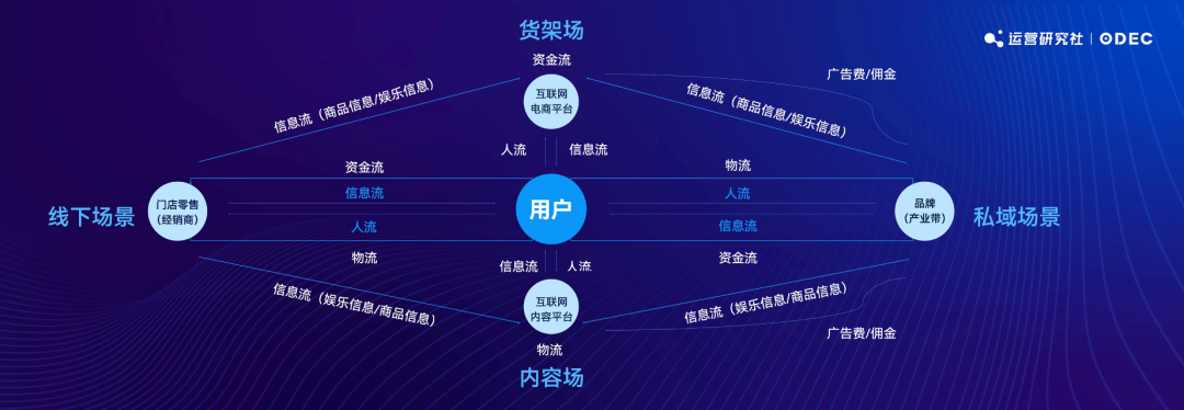 目前品牌做經(jīng)營主要包括線下場、貨架場、內(nèi)容場景、私域場。在 4 大核心場景里,品牌、平臺、消費(fèi)者、零售商形成了經(jīng)營四流的關(guān)系,它可以解釋非常多目前行業(yè)現(xiàn)象,比如,為什么淘寶和京東要拼低價(jià)。當(dāng)然也能很好地解釋為品牌增長的精細(xì)化要關(guān)注產(chǎn)品、流量、渠道。