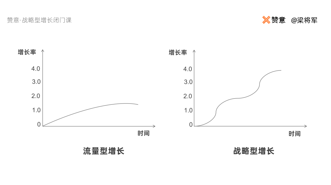 當(dāng)流量紅利見底,搞戰(zhàn)略比搞流量重要 1000 倍!1000 倍夸張了嗎?我覺(jué)得一點(diǎn)也不夸張。我們可以用一張圖來(lái)對(duì)比一下,“流量型增長(zhǎng)”和“戰(zhàn)略型增長(zhǎng)”的效率差異。