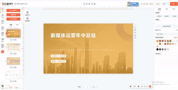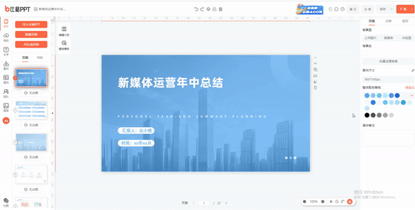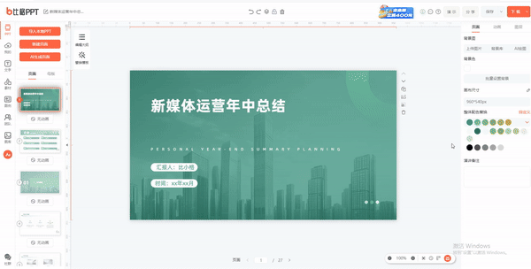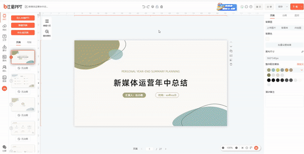 使用筆格PPT制作完成PPT后,點擊右側(cè)配色區(qū)可以選擇不同的配色方案進行整體配色替換。只需簡單的操作,即可瞬間改變整個 PPT 的色彩風格。