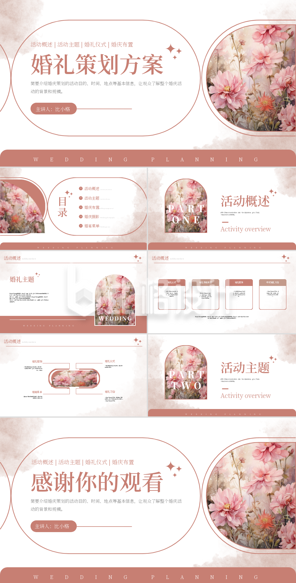 倘若您正在策劃一場婚禮儀式,粉色作為主色調(diào)再合適不過,它代表著溫柔、愛情與美好。搭配白色的花朵圖案和香檳色的裝飾元素,能讓整個 PPT 充滿夢幻優(yōu)雅的氣息,仿佛帶人走進一個甜蜜的愛情世界,為新人編織出最美好的婚禮愿景。
