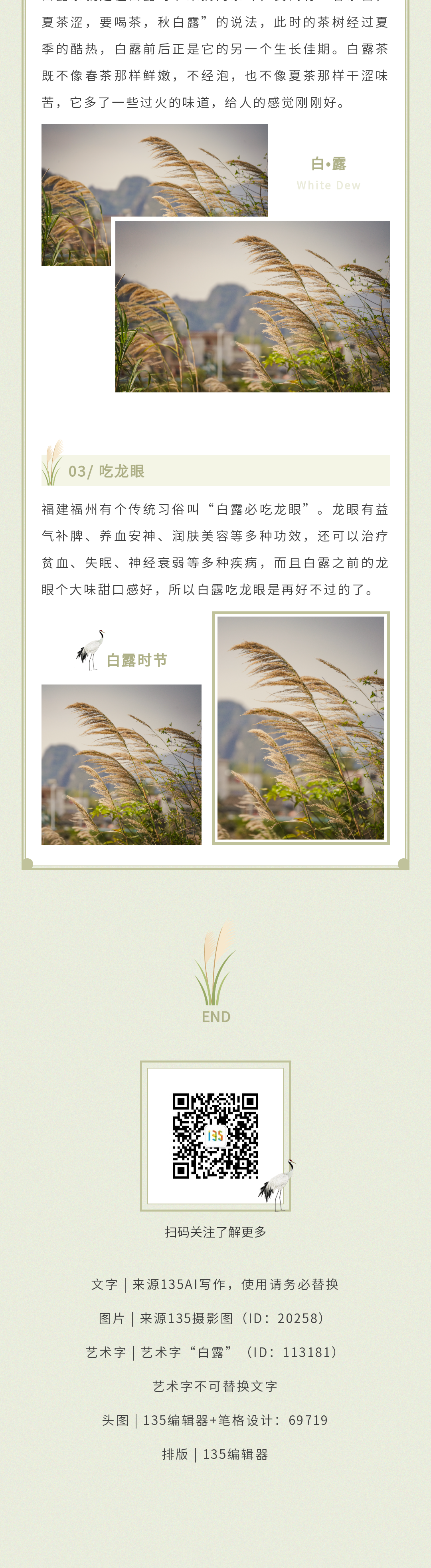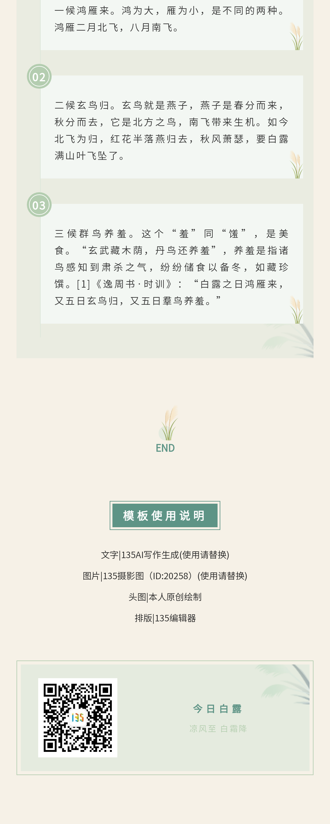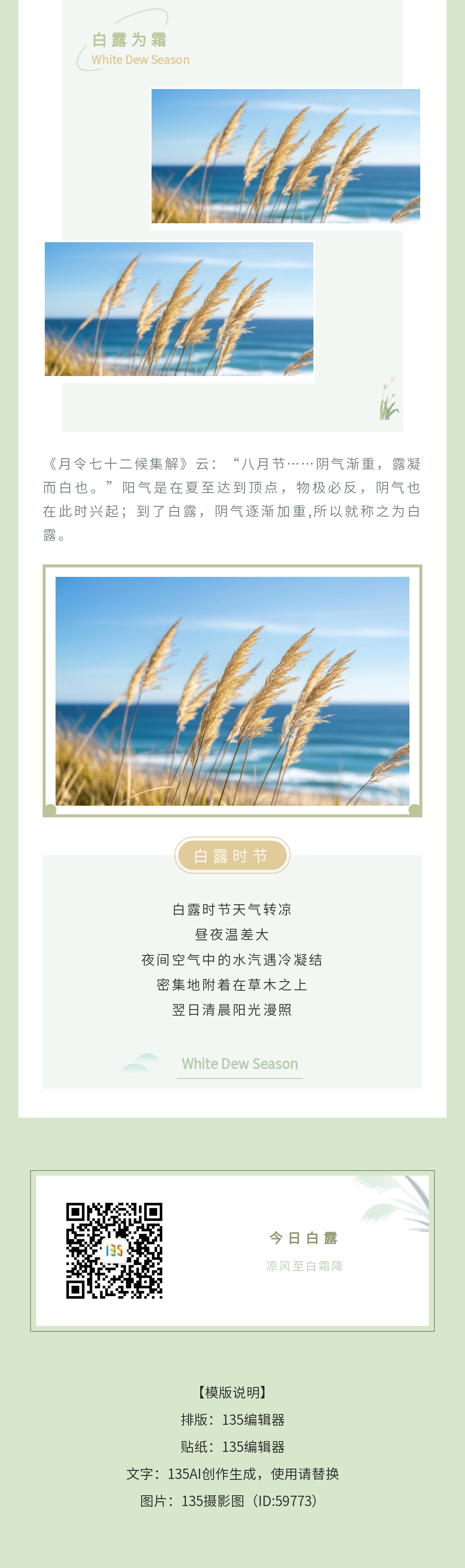 探索傳統(tǒng)節(jié)氣之美,"白露公眾號(hào)模板"帶來(lái)獨(dú)特的中國(guó)風(fēng)設(shè)計(jì)。精選白露公眾號(hào)模板,為您的新媒體運(yùn)營(yíng)增添古典韻味。立即體驗(yàn)135編輯器,讓每個(gè)節(jié)氣都充滿(mǎn)詩(shī)意。